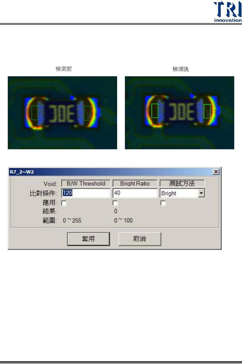 此檢測框是用來檢查元件的空焊、缺件、極性。利用灰階值(0-255)來設定門檻值及所
