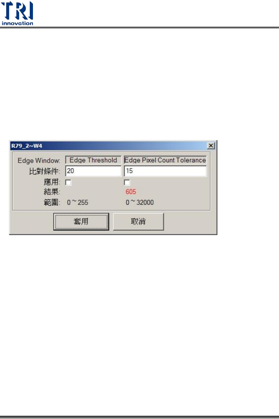 Test Resear ch Inc. 396 TR 7700 S II User Guid e – Softwar e [Train] 模式下的檢測參數設定畫面: 1. 設定 RGB 三色門檻值範圍的上限 (High) 及下限 (Low) 。 2. 設定檢測框內符合 RGB 門檻值範圍的比例容許上限 (Over Ratio) 及下限 (Under Ratio) 。即當檢測框內符合 RGB 門檻值範圍的比例低於下限或者高於上限時,判 定…
