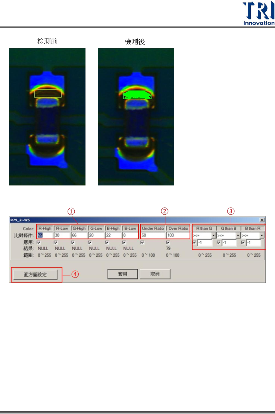 數設定畫面裡的 RGB 上下限。最後,按下[套用]後,檢測框即可根據設定做判定。