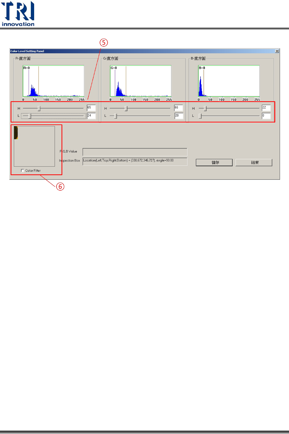 (代表檢測框內的顏色被選取) 。然後,按下[儲存],在按[結束],把參數套用到檢測參