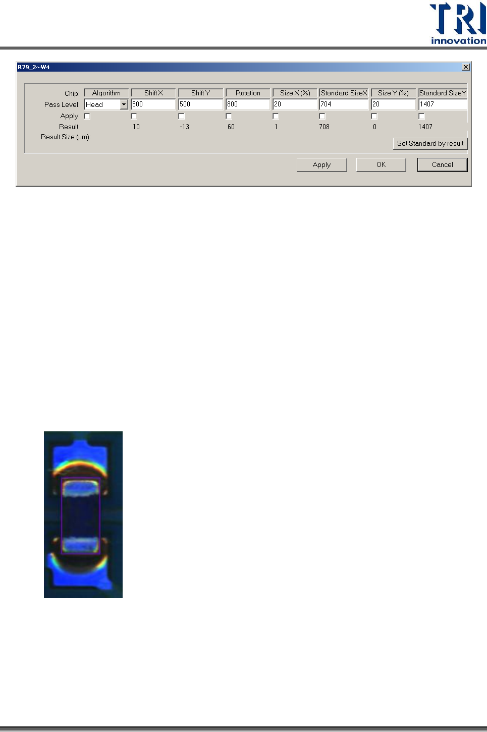 Test Resear ch Inc. 410 TR 7700 S II User Guid e – Softwar e 參數說明: 位置偏移值 (Shift X/Shift Y ,預設 500 μ m) : 所找到 Chip 中心點與檢測框中心點 的距離。 旋轉角度 (R ot at ion ,預設預設 8) : Chip 的旋轉角度。 尺寸 (Size X/Size Y ,預設 20%) : Chip 尺寸與檢測框大小的…