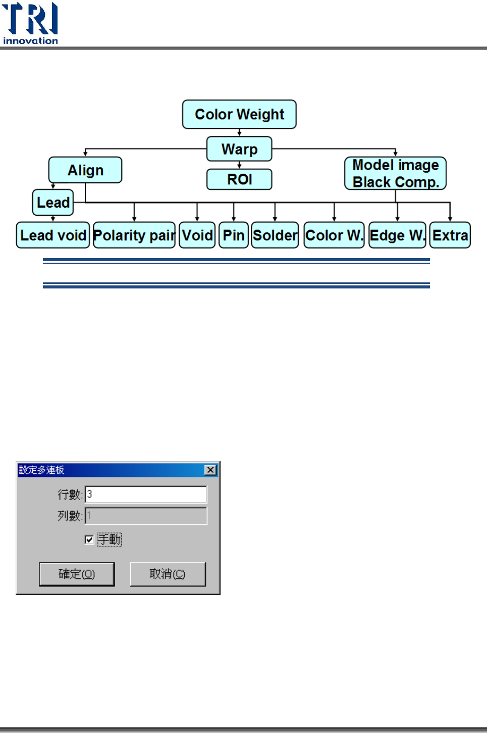 Test Resear ch Inc. TR 7500 Series User Guide – Soft ware 419 4.10.4 檢測框之 架構 位於上層的檢測框可以幫助下層的檢測框進行定位 4.11 特 殊連板程 式製作方式 4.11.1 非制式連 板程式製作 若待測板為非制式連板即非 MxN 所能描述的連板,則需按照以下步驟進行程式製作。 Step1. 載入 CAD 檔案,先載入其中一片板的 CAD 檔案。 Step2. 設…