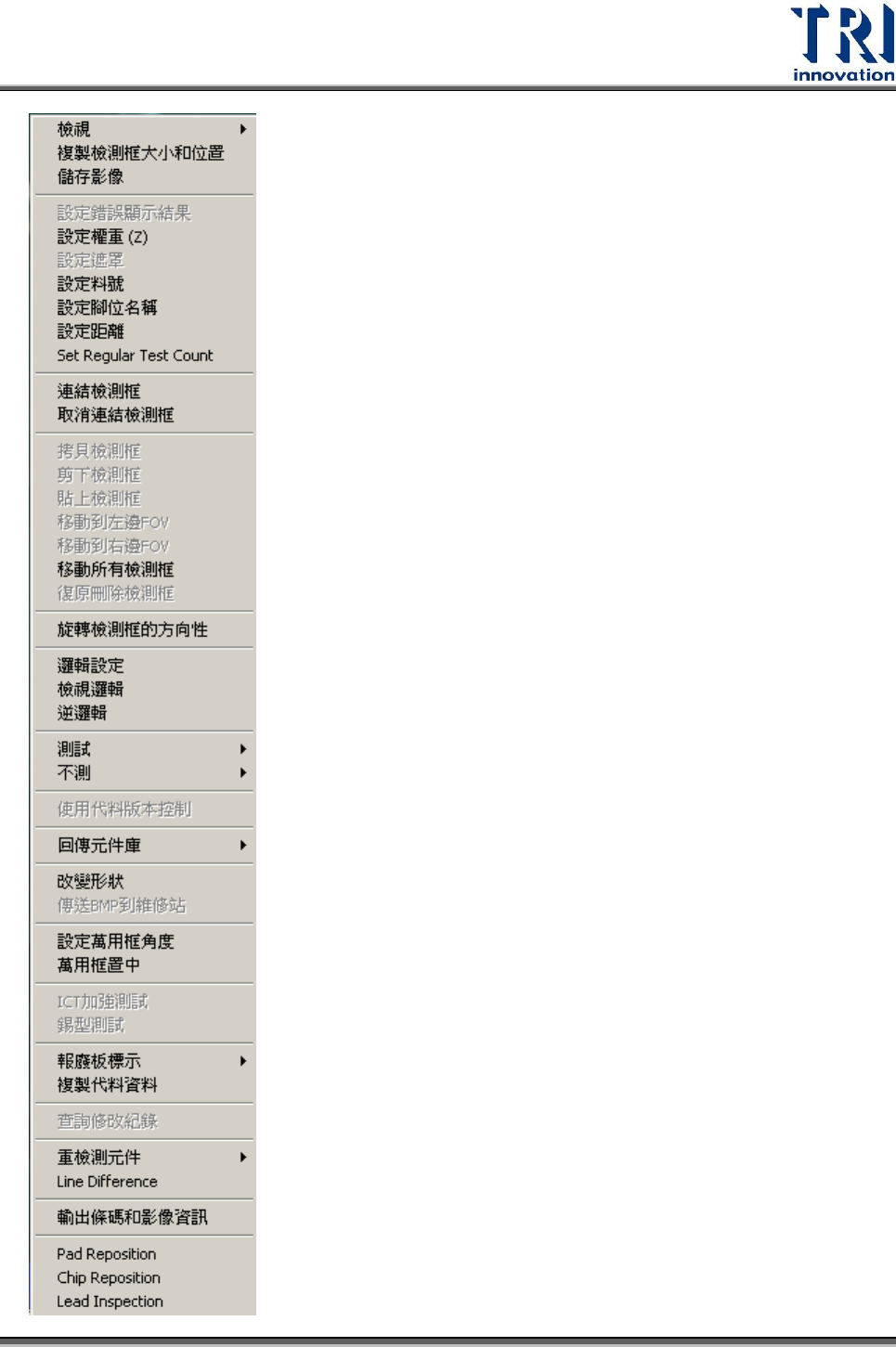 Test Resear ch Inc. TR 7500 Series User Guide – Soft ware 431 在右方 FOV 區域點選 [Real FOV] 頁籤,即可顯示出目前攝影機實際取得的電路板影 像,可以在 [ 電路板大圖 ] 上的 FOV 區域直接點選,且在此影像範圍內按滑鼠右鍵移 動攝影機取像。 5.5 已儲存 FOV 的 功能表 在 FOV 區域內按下滑鼠右鍵會出現功能列表: