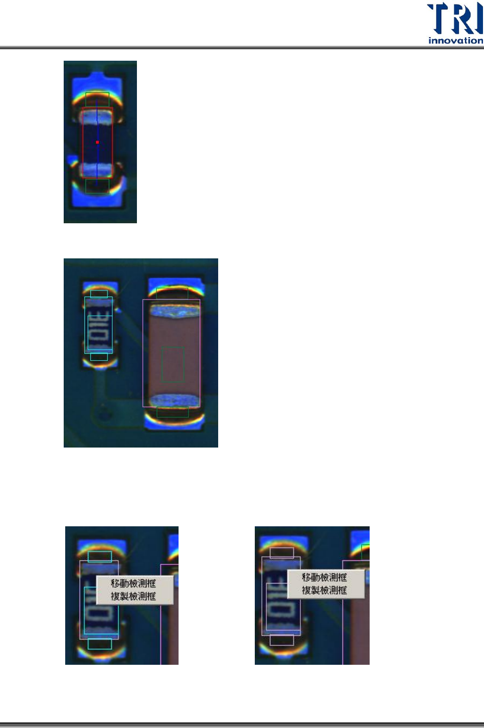 Test Resear ch Inc. TR 7500 Series User Guide – Soft ware 435 檢測框方向性 :以圓點來表示腳位的方向性。正確的腳位方向性如下圖所示。 顯示遮罩 :顯示有作遮罩功能的檢測框。 Show Enhance :顯示有作影像強化的檢測框。 在萬用框中顯示檢測框的權重影像 :會根據目前點選檢測框所設定的權重來顯 示影像。 顯示缺陷分布圖 :會在電路板大圖像區顯示缺陷分…