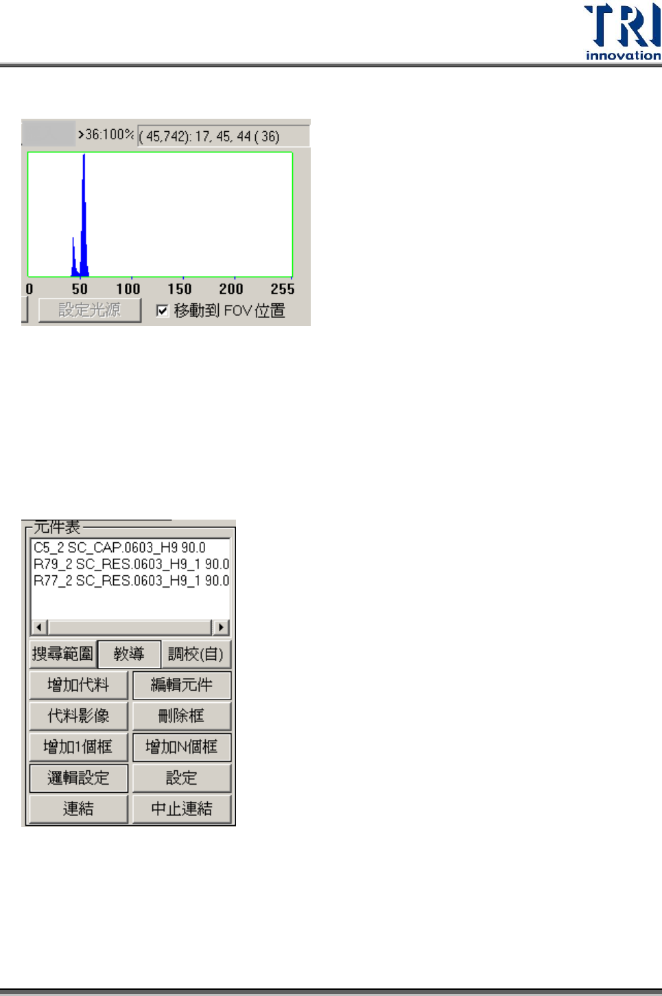 此區域會顯示出萬用框內的灰階點數分布情況。橫軸表示灰階值,縱軸表示畫素(pixel)