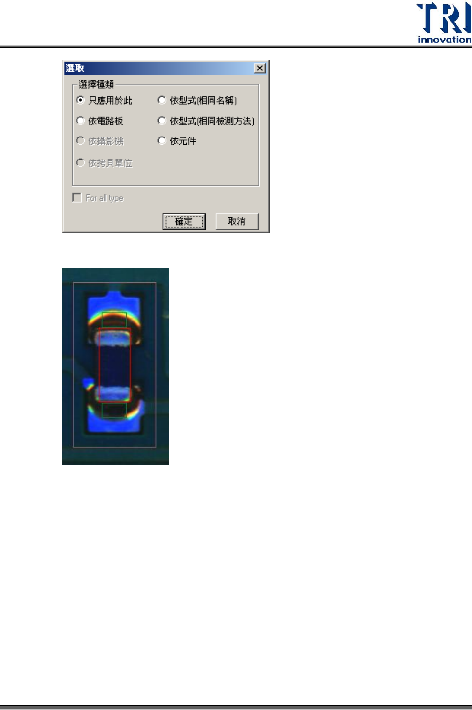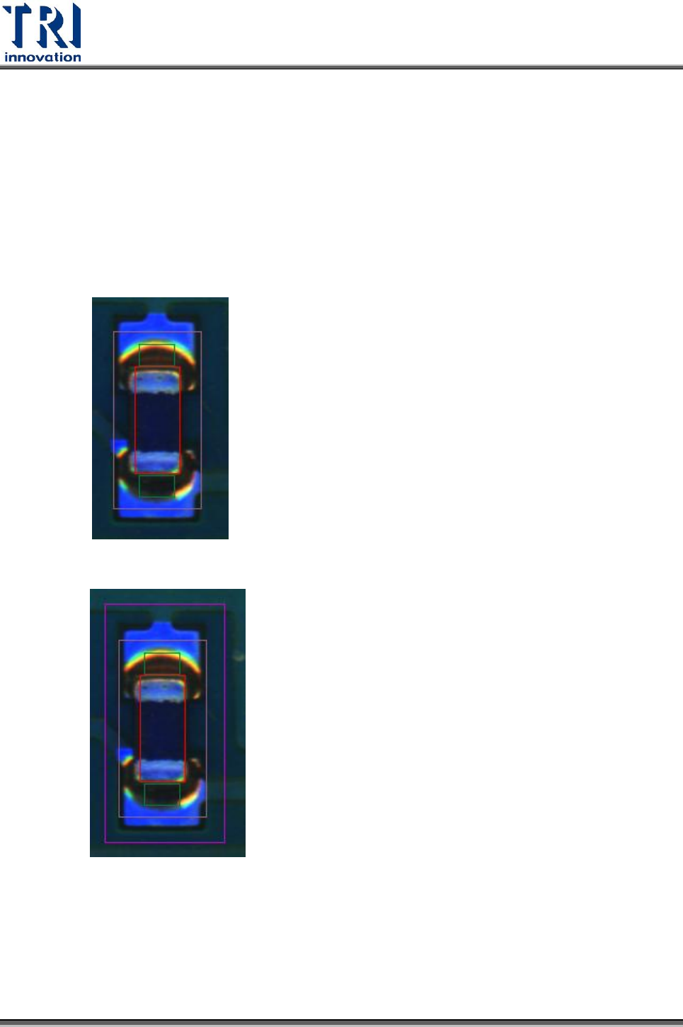 Test Resear ch Inc. TR 7500 Series User Guide – Soft ware 469 2. 搜尋範圍 改變影像比對類型檢測框 (Missing/MissingPolarity/Lead/Align/Warp) 的搜尋範圍。系 統會給予檢測框一預設的搜尋範圍,並在此檢測範圍內搜尋是否有與標準影像相似性 高的影像,而使用者可以在此變更搜尋範圍。 設定步驟: Step1. 可在 FOV 影像中選擇 [ 檢…
