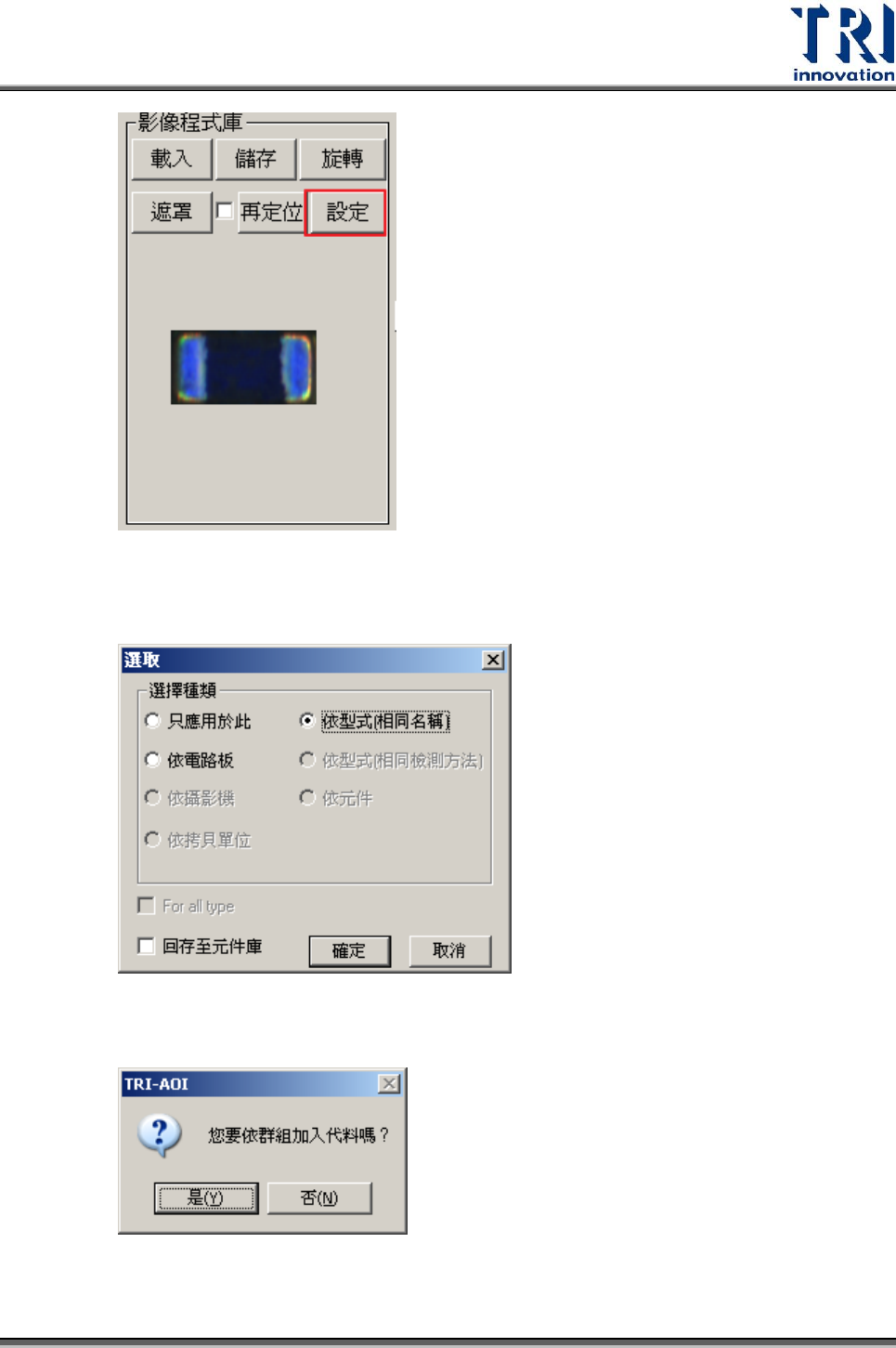 Test Resear ch Inc. 472 TR 7700 S II User Guid e – Softwar e Step4. 按下 [ 增加代料 ] 按鈕。 Step5. 選擇套用規則即完成新增代料影像。 Step6. 選擇是否要依群組加入代料。選 [ 是 ] ,則該元件會儲存在相同類型元件的 R 或 C 類的群組中;選 [ 否 ] ,會則該元件會儲存在 None 的群組中。