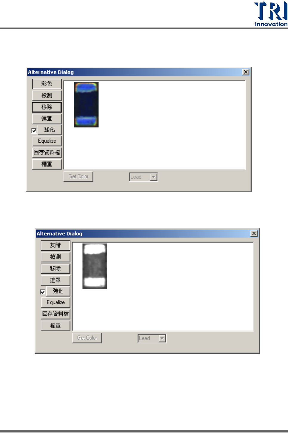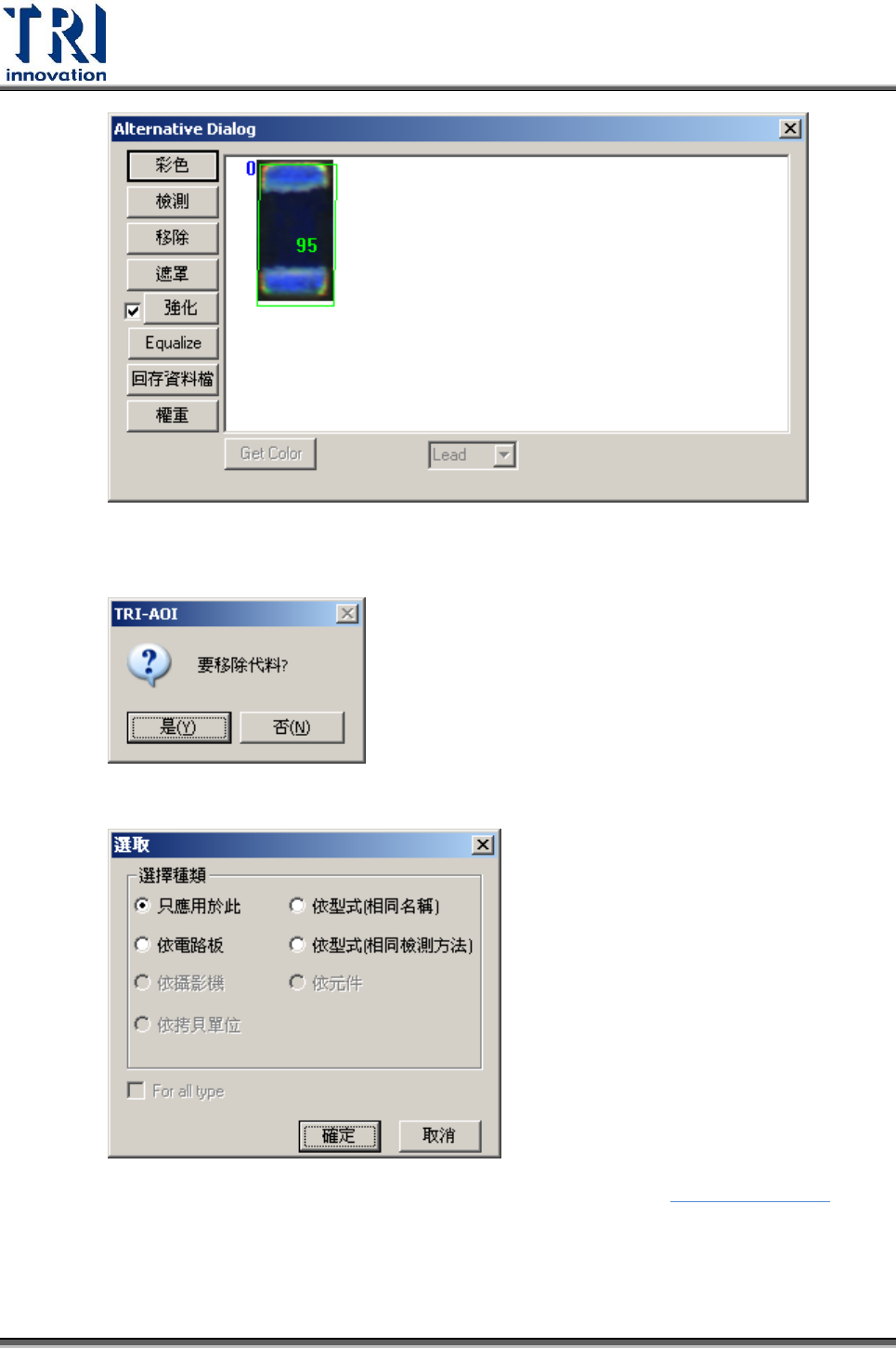 Test Resear ch Inc. 474 TR 7700 S II User Guid e – Softwar e 7. 代料影像 檢視所選擇檢測框的所有標準影像,並對標準影像進行修改。 選項說明: 彩色:切換至灰階影像。在點選一次 [ 灰階 ] 後會回覆到彩色。 檢測:待測影像與標準影像相比之相似度 (%) 。左上角之藍色數字代表強化影 像的次數。