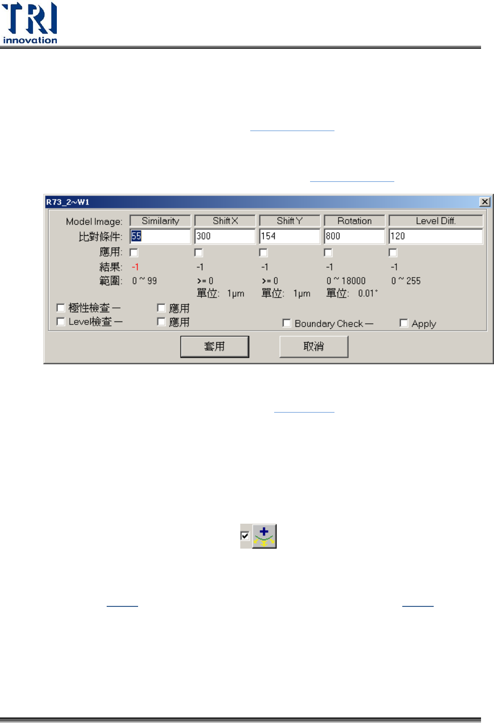 Test Resear ch Inc. 482 TR 7700 S II User Guid e – Softwar e Step1. 將萬用框移到欲設定板彎框的位置上。 Step2. 選擇是否要在前方空格打勾,接著按下本按鈕。 Step3. 出現以下檢測框。 [ 依拷貝單位 ] 選項點選表示將此設定套用到其他片多連板 的相對位置上。若在後方方塊打勾的話,表示在其他片電路板 FOV 內的檢測 框會根據原本 FOV 與其他 FOV 中 […