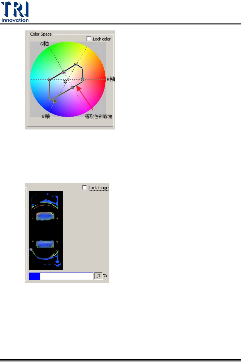 框內的影像。使用者可以用滑鼠右鍵在影像上拖曳出要選擇的顏色範圍,程式