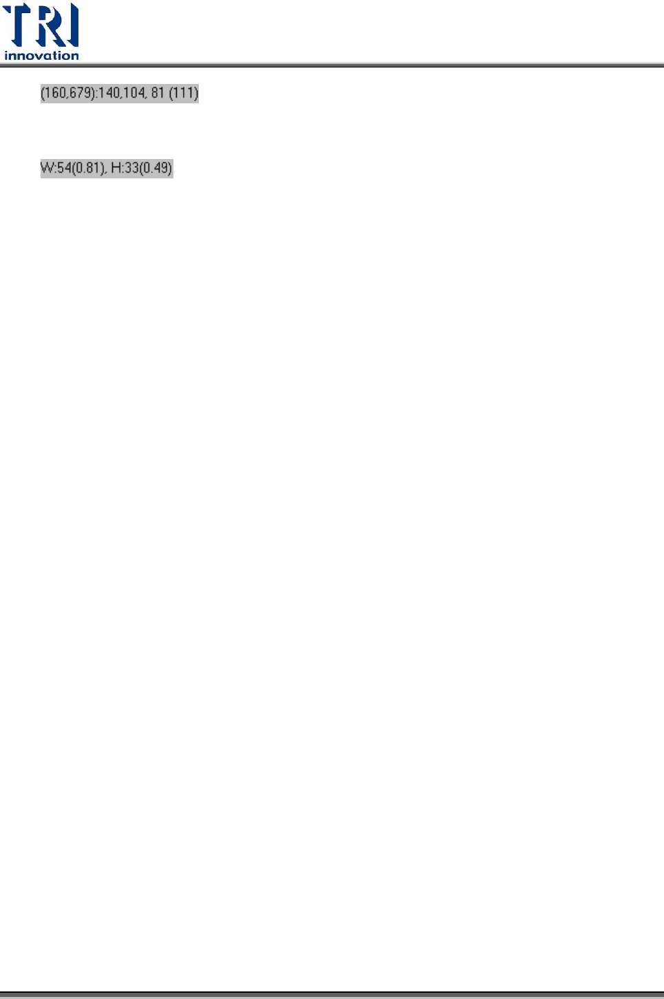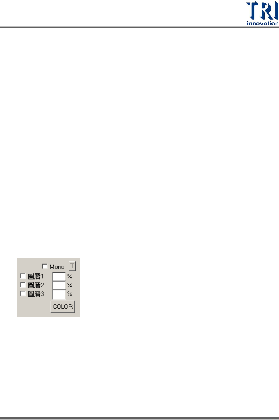 Test Resear ch Inc. TR 7500 Series User Guide – Soft ware 503 :括號內顯示目前滑鼠游標所在 FOV 座標位置,接下來三個 數字分別表示游標位置的 R 、 G 、 B 分量,最後括弧內的數字表示權重計算後的灰階 值。 :顯示所點選的檢測框的長寬,單位為畫素 (pixel) ,括號內單位 為公厘 (mm) 。 關閉 :關閉影像視窗功能。
