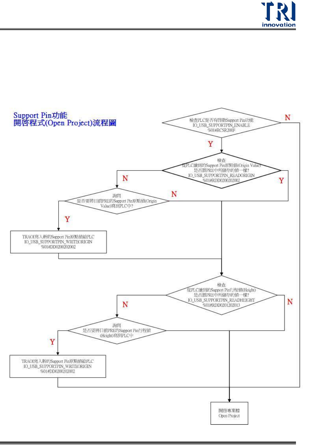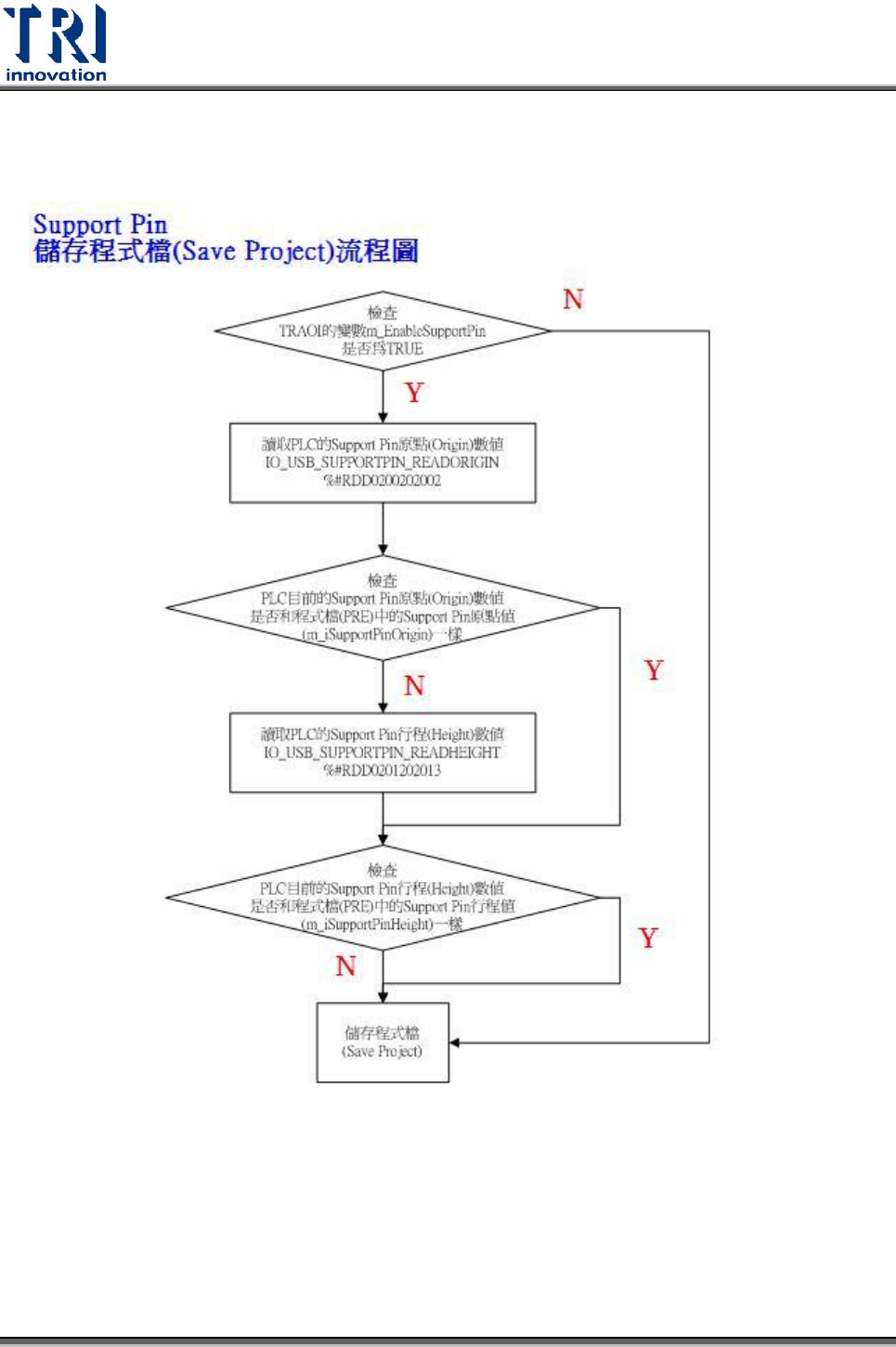 Test Resear ch Inc. 518 TR 7700 S II User Guid e – Softwar e AOI 主程式在存檔的時候,詢問是否要將目前 PLC 的 Support Pin 原點 (Origin) 和行 程 (Height) 儲存到專案檔 (*.PRE) 中。 2. AOI 主程式流程說明