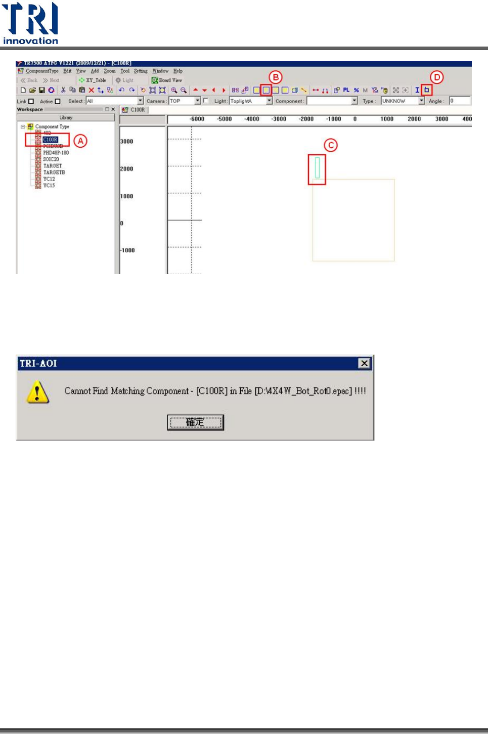 Test Resear ch Inc. TR 7500 Series User Guide – Soft ware 527 如果所選擇的元件,並沒有存在於 epac 檔案中,則會顯示找不到相對應元 件的訊息。 元件的 Body 框會影響腳位產生,所以 Body 框的大小要根據實體影像,拉 出正確的框。