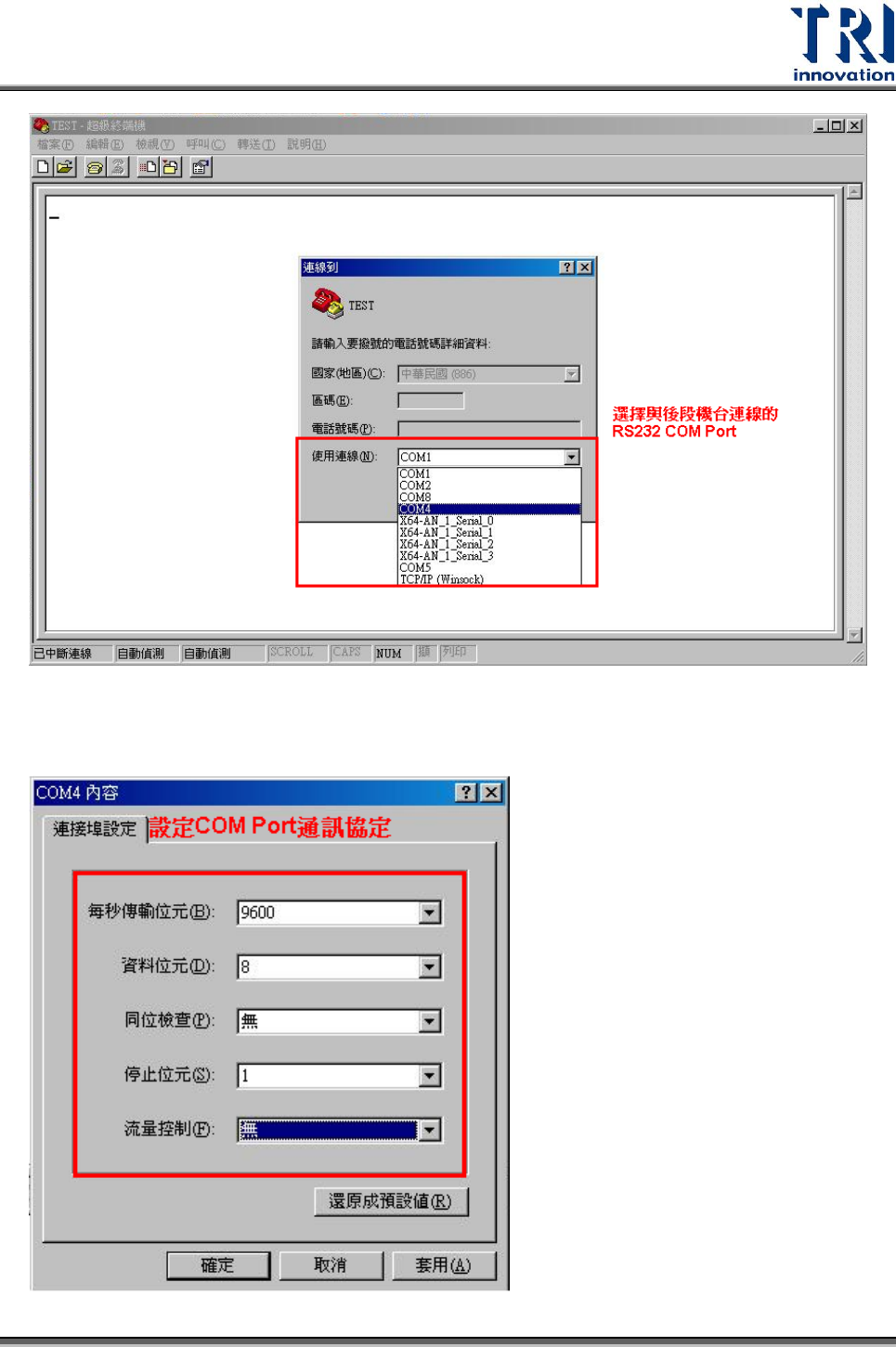 Test Resear ch Inc. TR 7500 Series User Guide – Soft ware 535 Step7. 中斷連線。 Step8. 選擇 [ 內容 ] 。 Step9. 切換到 [ 設定 ] 頁面。點選 [ASCII 設定 ] 。