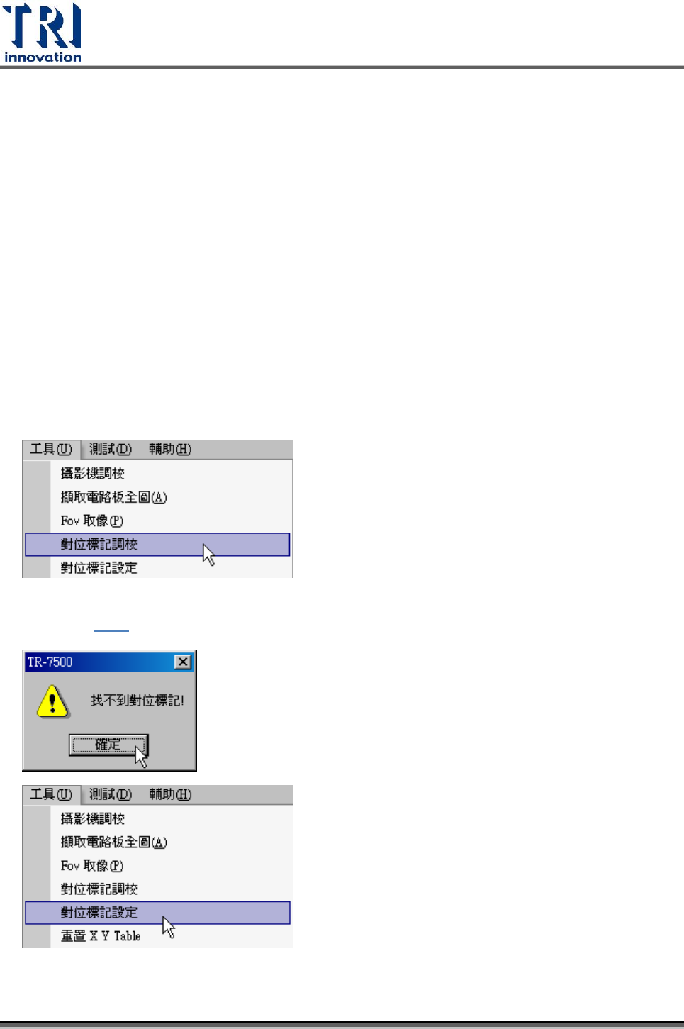 Test Resear ch Inc. 560 TR 7700 S II User Guid e – Softwar e 3. 程式載入中出現詢問是否載入自動板寬視窗,若機器有安裝自動板寬模組,且在 程式撰寫時有儲存輸送帶寬度,則可選擇 [ 是 ] ,板寬會自動調整至所需大小。若 沒有裝置自動版寬模組,則需使用 PLC 手動設定板寬。 4. 按下 [Insp ect] 按鈕,系統即可開始檢測 5. 在人機界面按下 [ 開始測試 ] 。 …