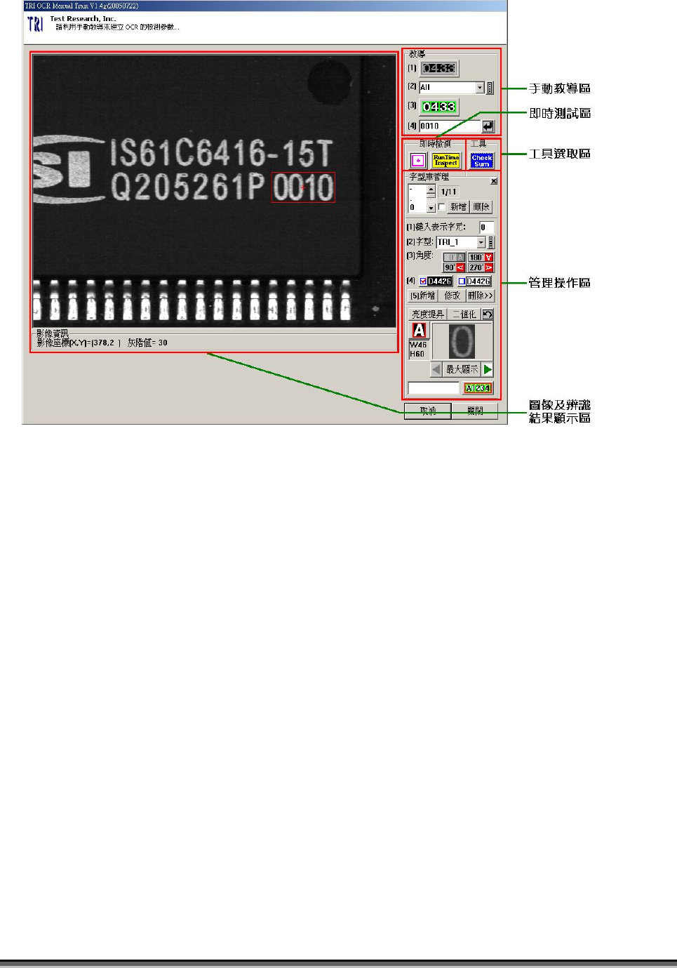 2. 即時測試區:當 OCR 字串教導完成後,可利用此功能進行 Off-Line 檢測,檢測的