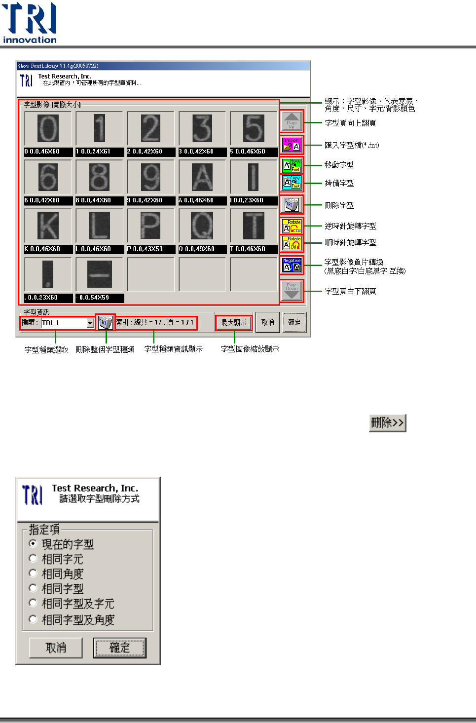Test Resear ch Inc. TR 7500 Series User Guide – Soft ware 599 4.8 Font Delete Dialog 在 Font Library Manager 字型庫管理界面下,當點選「組合式刪除」 功能項 時,可呼叫出如下圖的窗口,此窗口主要是以組合式條件來刪除字型之機制,內容包 含之功能如下所示: