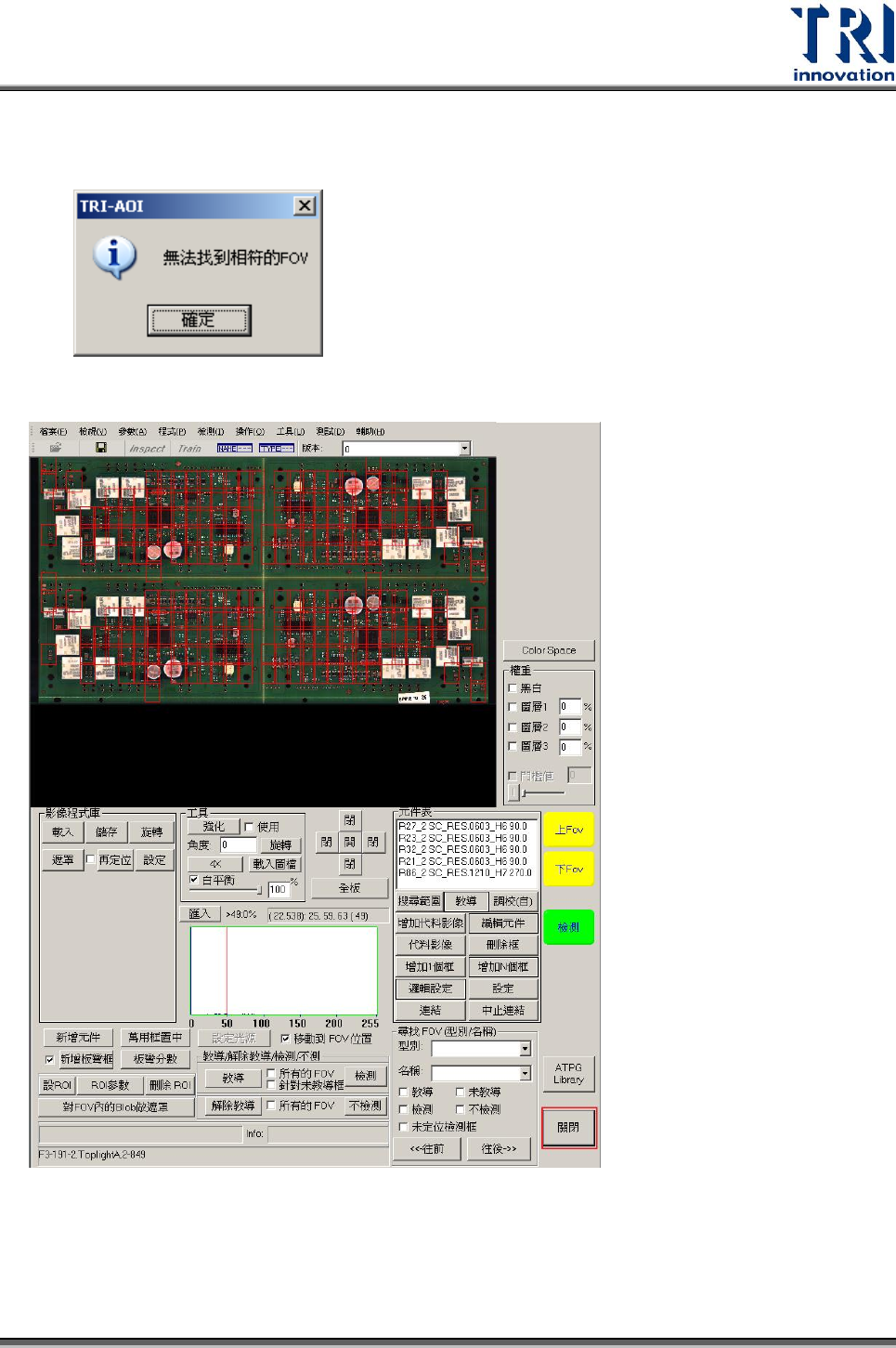 Test Resear ch Inc. 48 TR 7700 S II User Guid e – Softwar e 5. 當所有的 FOV 中的檢測框都確認教導後,按下 [ 往前 ] 或者 [ 往後 ] 都會產生以下視 窗,代表所有的檢測框都已經教導完成。按下 [ 確定 ] 繼續動作。 6. 按下 [ 關閉 ] 離開 Train 視窗。