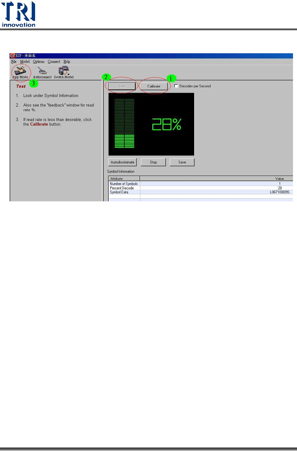Test Resear ch Inc. TR 7500 Series User Guide – Soft ware 607 6. 連線成功後,會進入 E SP 的調整界面。 使用者可以利用 [Calibrate] 按鈕來進行讀取效果的調整 使用者可以利用 [Test] 按鈕來確認目前條碼的辨識率 接下來選擇 [App Mode ] 準備進入設定參數頁面