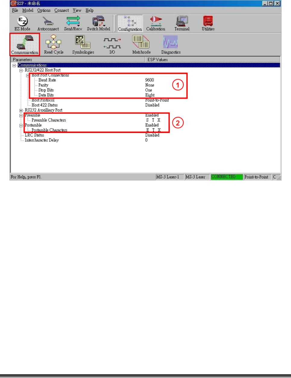 通訊頁面參數 (Communication)–確認(1)COM Port 通訊格式及 (2)條碼字串接