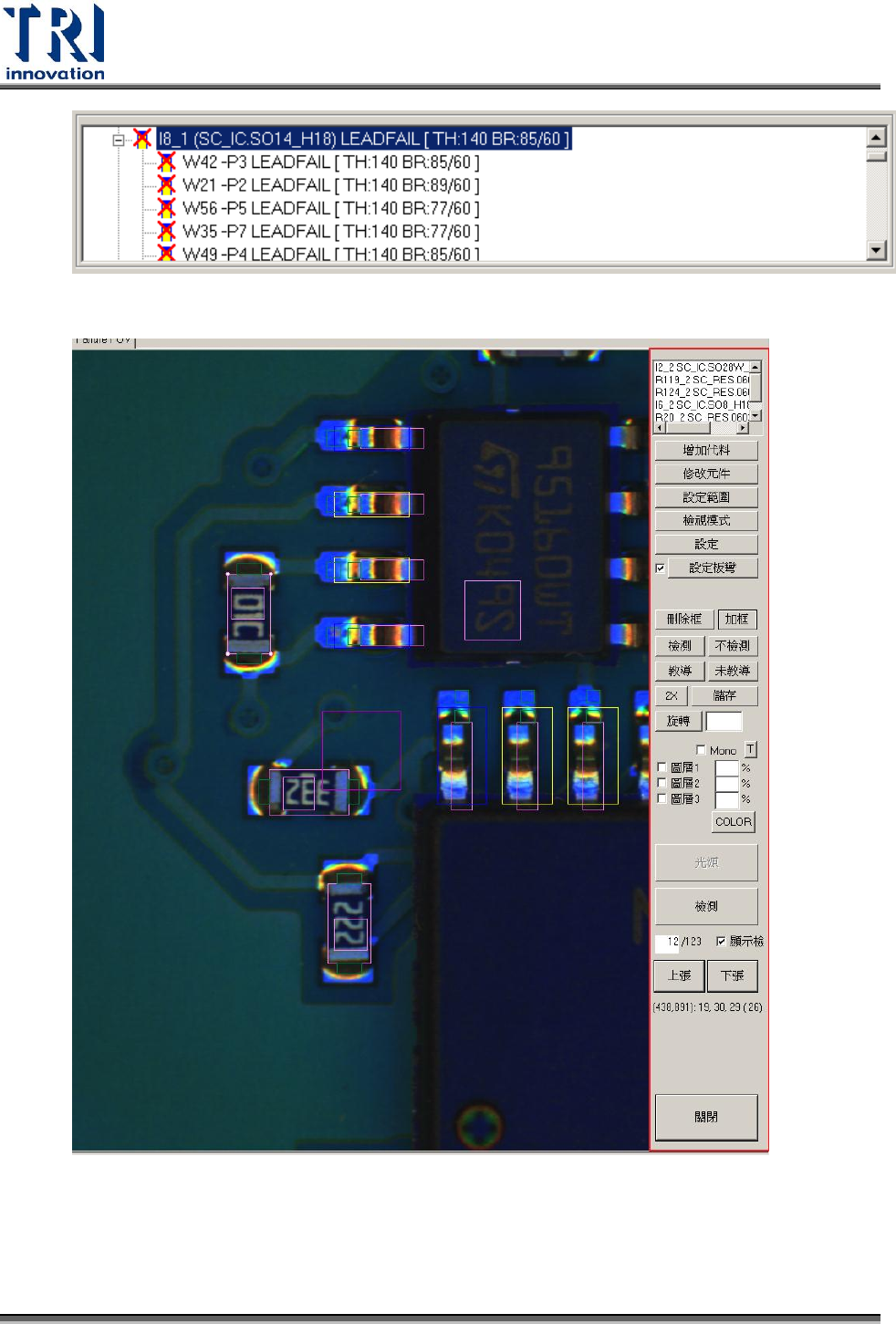 Test Resear ch Inc. 50 TR 7700 S II User Guid e – Softwar e 3. 可按 [ 下張 ] 按鈕,依序檢視 F OV 內檢測框的設定。亦可直接輸入號碼,將影像跳 至指定的缺點 FOV 。 4. 在影像區或元件列表區點選缺點元件時,右方的缺點樹狀圖列表會自動將該元件 的缺點列表標示出來,使用者可由此確認缺點的檢測框。