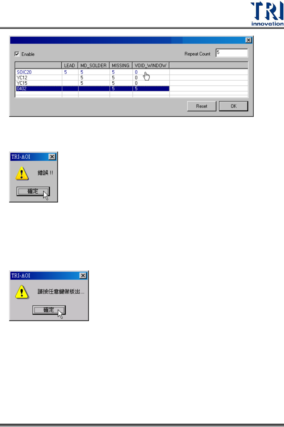 Test Resear ch Inc. 66 TR 7700 S II User Guid e – Softwar e 警告訊息視窗 3.3.2.2 當對位點發生錯誤時停機 當找不到對位標記時,機器之動作停止並發出出板訊息。若使用連線模式,當停機 時機器的三色燈會亮紅燈並出現警報聲,待人員至電腦前按下確定鈕後,待測板會 送到出口端。 3.3.2.3 當條碼發生錯誤時停機 需將 [ 測試前檢查條碼 ] 打勾此選項才有作用。勾選…