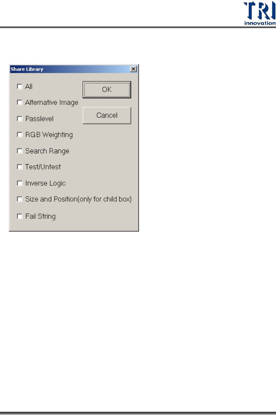 Test Resear ch Inc. 68 TR 7700 S II User Guid e – Softwar e 3.3.2.6 設定共享元件資料庫項目 啟動本功能時,代料影像可與所有 Project 共用。 1. Alternati ve Image 新增代料影像:當使用者在 Project 新增代料影像時,軟體會出現一個視窗,詢問 是否要將本操作設定到 Library 。若勾選,則代料影像除了存入 Project 之外,也…