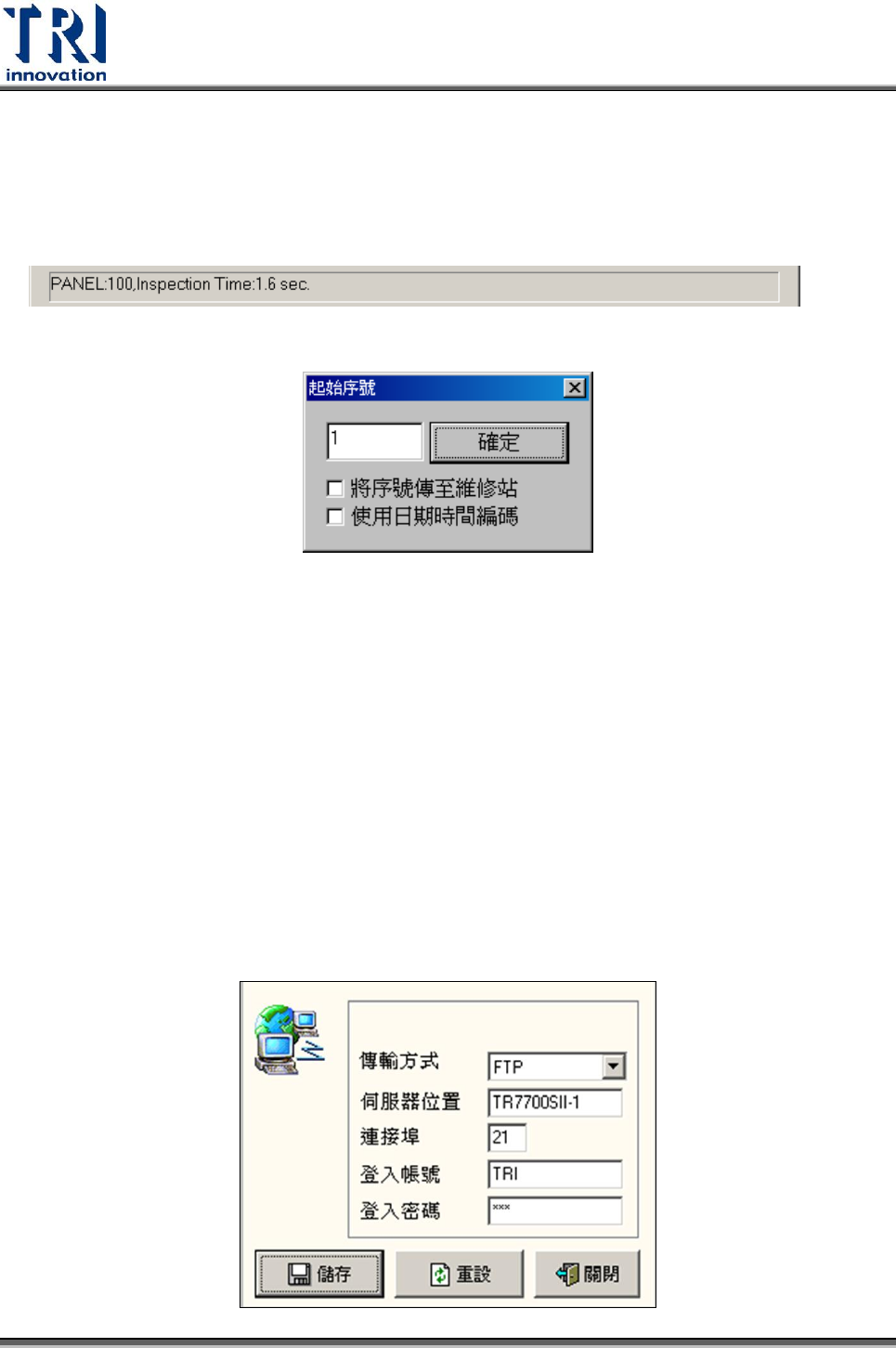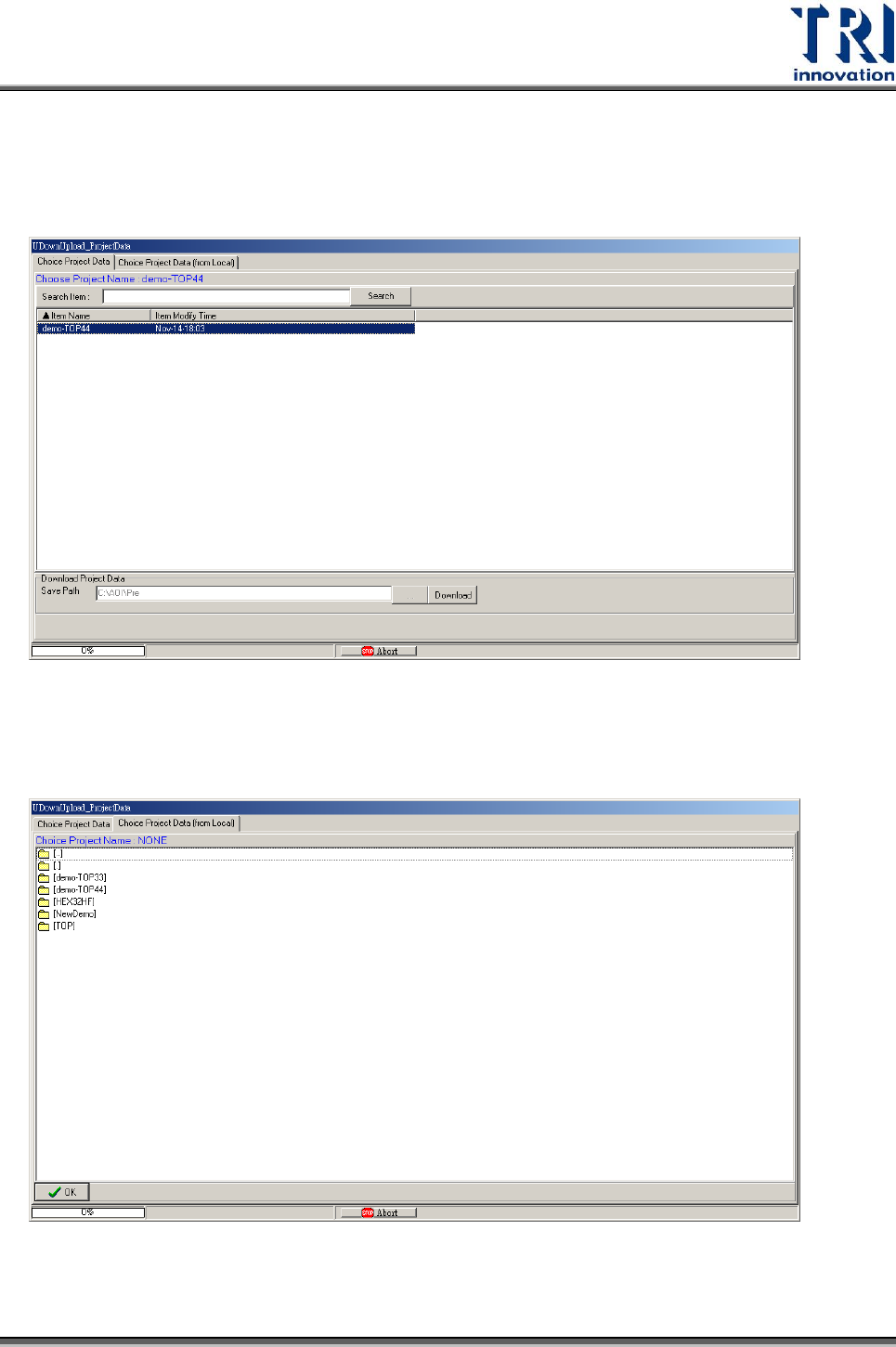 Test Resear ch Inc. 78 TR 7700 S II User Guid e – Softwar e 3. 在設定完成後,開啟 [ 聯結到專案伺服器 ] ,以進入連線模式。 4. 在連線模式中載入專案會出現 Project Server 的控管對話框,選擇所需要的專案 下載並載入該專案。 5. 若需要載入本地端的專案,請切換控管對話框最上面的頁籤到 Choice Project Data(from Local) ,並選…