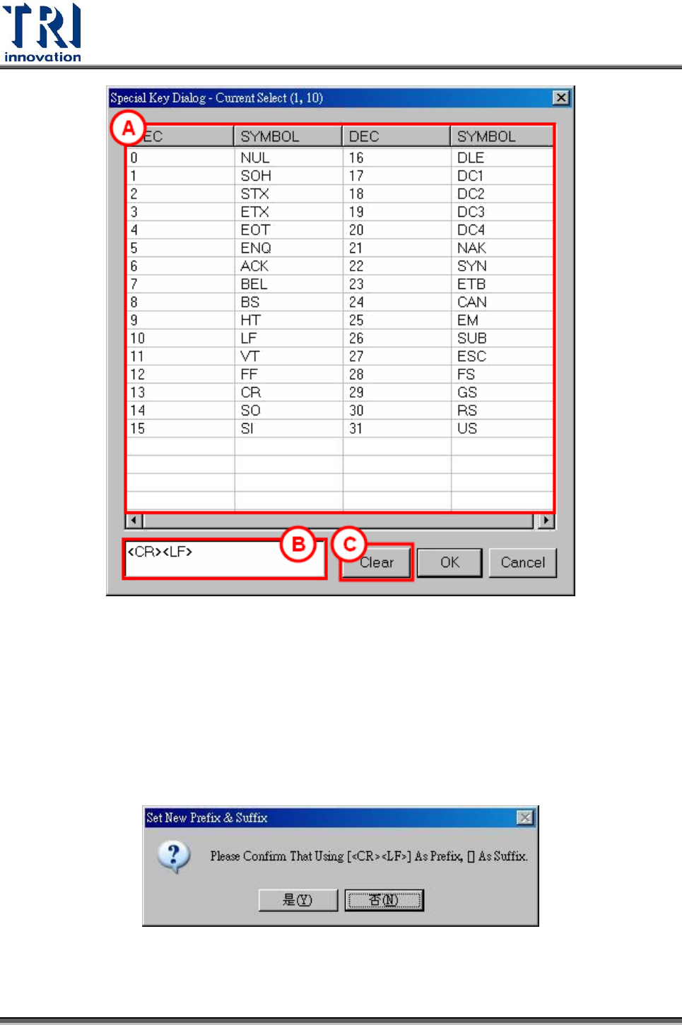 A:特殊字元顯示清單(ASCII Code 0-31)。使用者使用滑鼠點擊清單,該特殊字