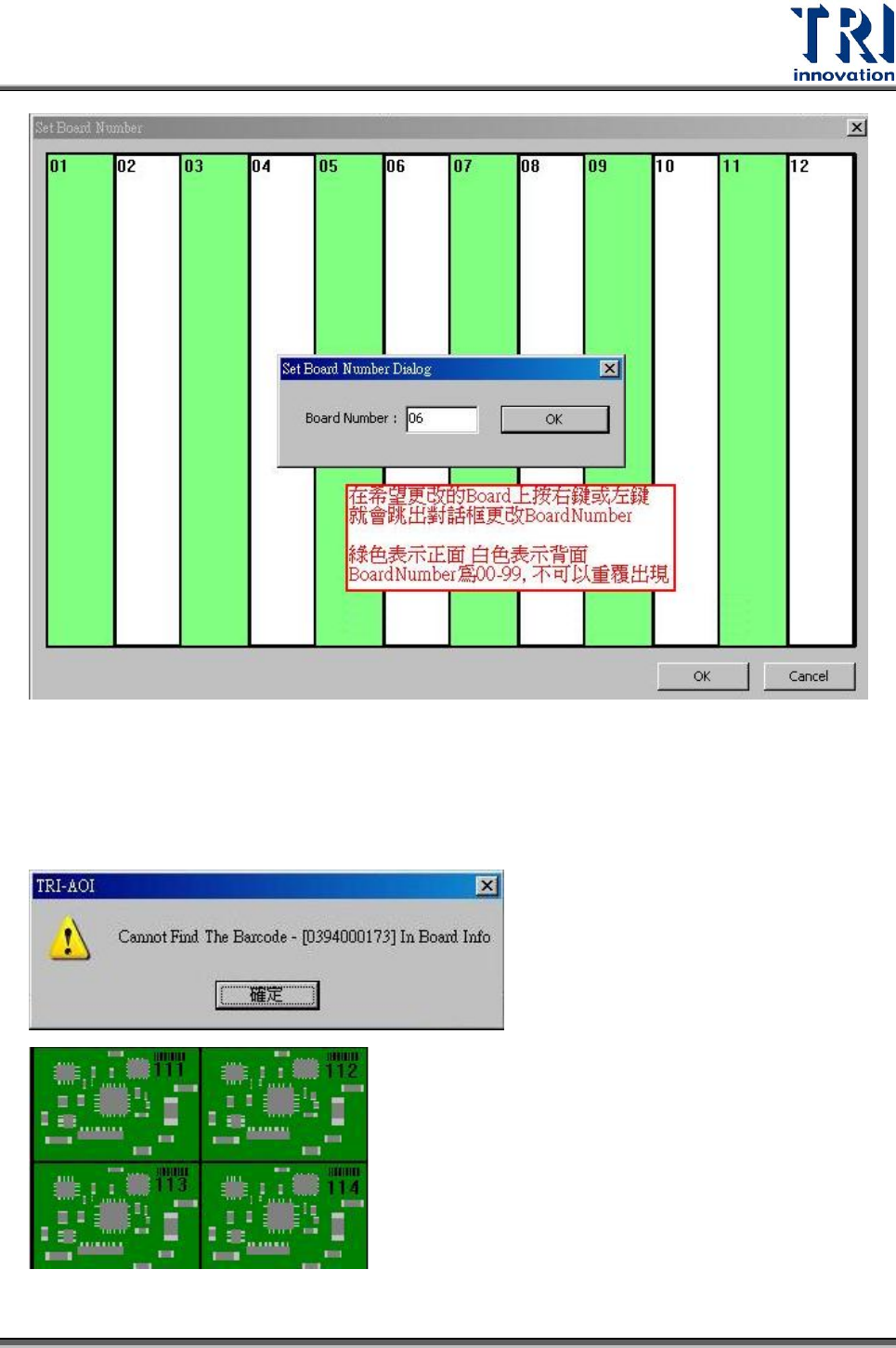 Test Resear ch Inc. TR 7500 Series User Guide – Soft ware 103 Step6. 如果有找到,會根據條碼的末兩碼去判定現在板子是正面還 是背面, 根據正面或背面來產生相對應的 Barcode Strings 。 條碼以一帶多功能加入,根據讀到的條碼判斷待測板擺放位置為 0 度或 180 度。 此判斷模式只會套用在以一帶多,手動鍵入條碼尾數。 Step4. 啟動以一帶多的功能,選…
