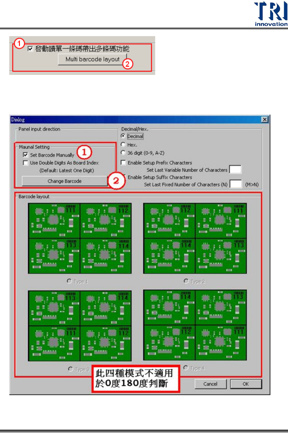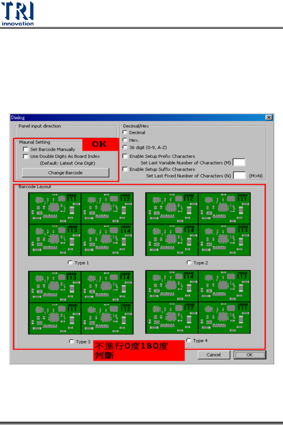 Test Resear ch Inc. 104 TR 7700 S II User Guid e – Softwar e Step5. 進版方向會影響 0 度 180 度判斷,所以要告知進版方向。以一帶多的模式 裡,只有手動設定條碼尾數號,才可以進行 0 度 180 度判斷。其他四 種模式 均不會做判斷。