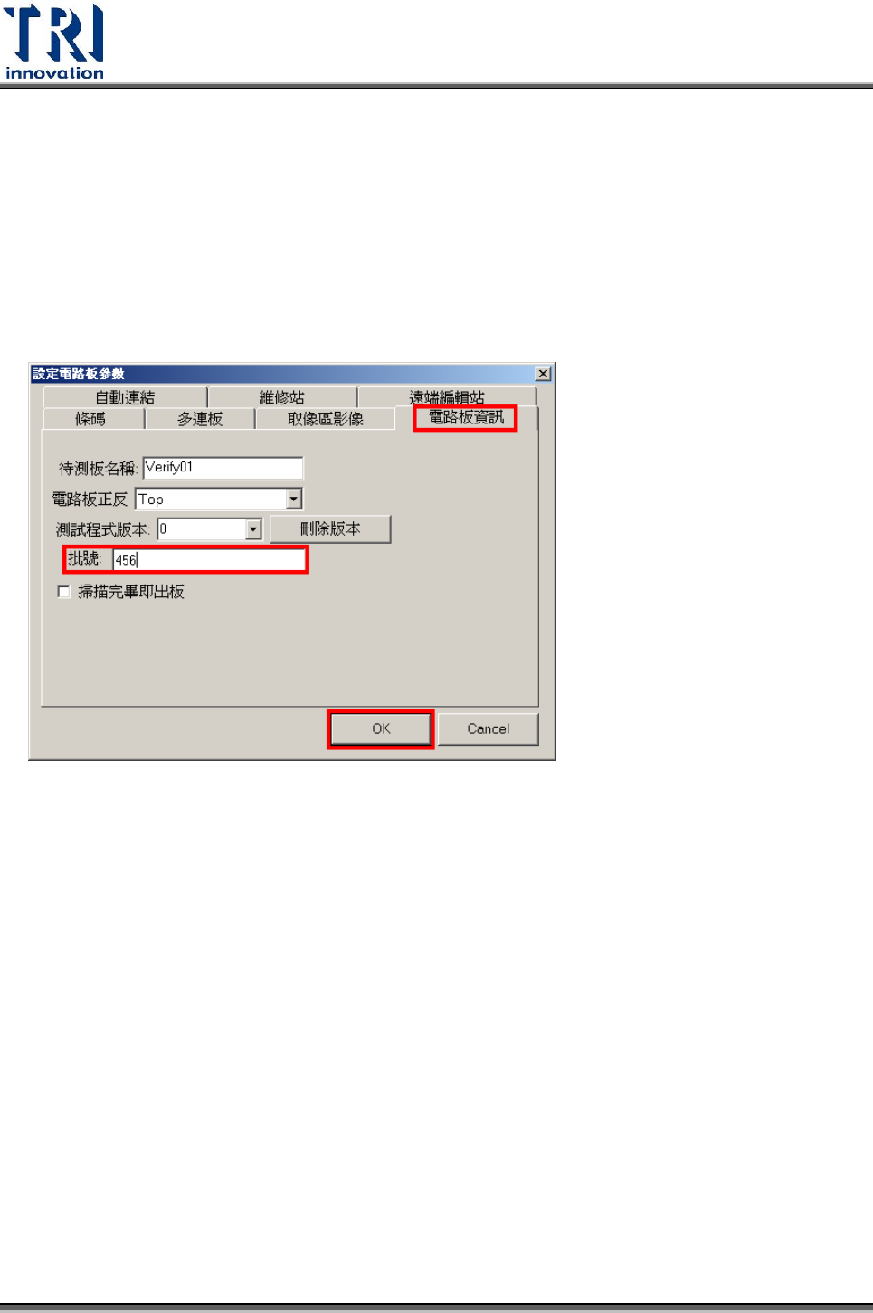 Test Resear ch Inc. 184 TR 7700 S II User Guid e – Softwar e 3.5.10 啟動預讀 條碼 此功能僅在連線模式下使用。開啟該功能會自動將註冊表的 [BoardSyncInOut} 值 設為 1 。 PLC 的部分,將 [ReadBarcodeAfterBoardIn] 反黑。跟前段軌道通訊部份,除了原本 的黑綠線為要板訊號外,仍須加接一組紅藍線為硬體條碼的觸發訊號。如果硬體條碼…