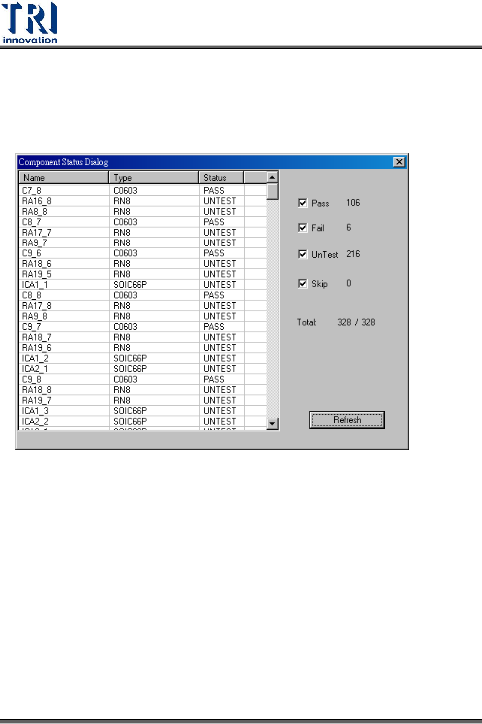 勾選[Pass]、[Fail]及[Untest]後,按下[Refresh]按鈕,系統會自動統計出本片板子檢測