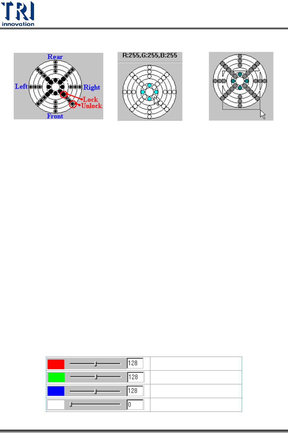 4. 強度:由此區域可調整 LED 的亮度,紅、綠、藍、白四色調整區表示分別調整該