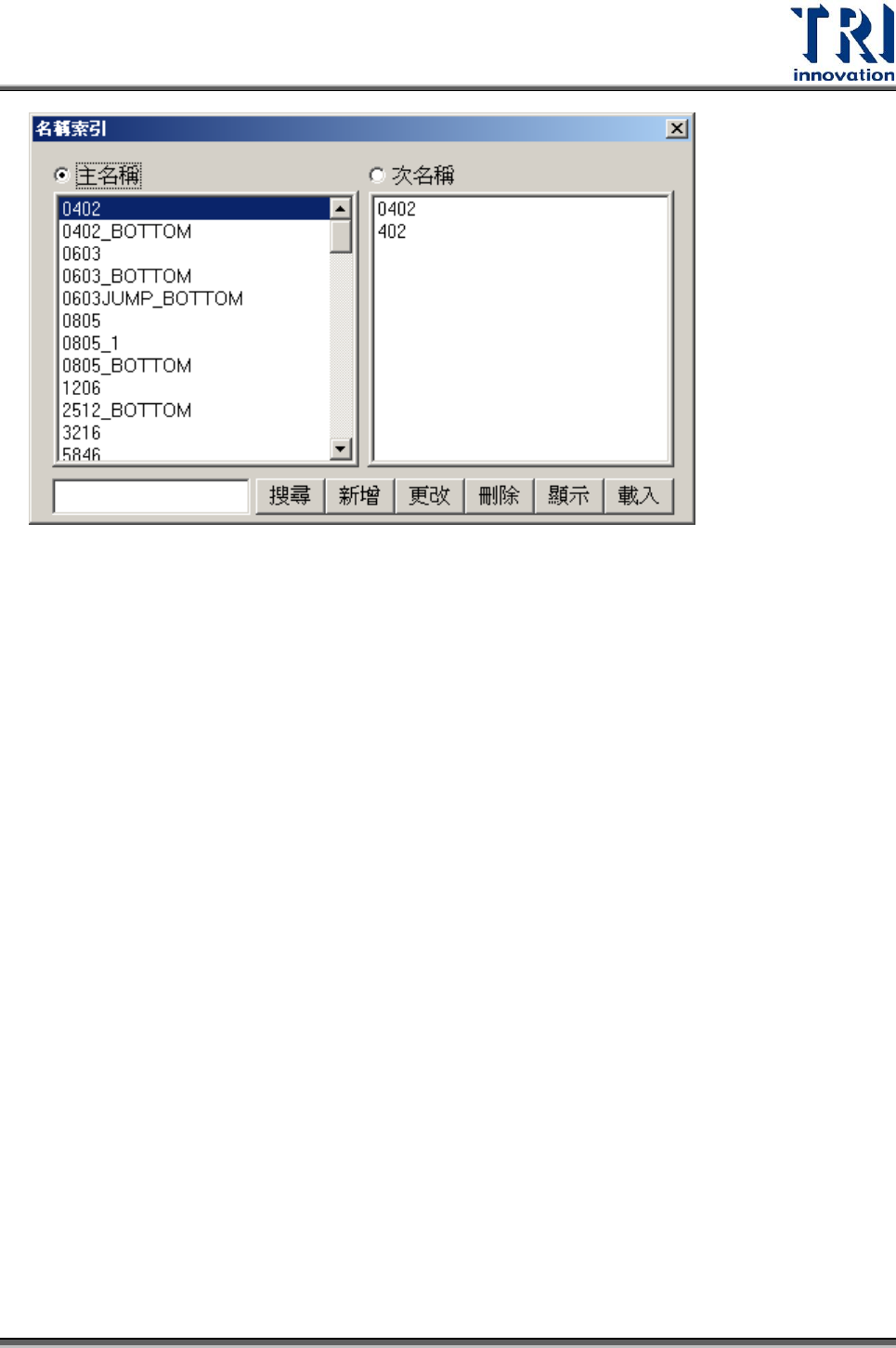 Test Resear ch Inc. 330 TR 7700 S II User Guid e – Softwar e 搜尋 :根據左下角輸入欄位之內容尋找完全吻合的形式名稱,無論是在主名稱欄或 次名稱欄中有找到的就會被列出。 新增 :新增一個名稱索引至所點選的欄位中。 新增一索引至主名稱: (1) 點選 [ 主名稱 ] 。 (2) 輸入名稱。 (3) 點選 [ 新增 ] 。 新增一索引至次名稱: (1) 點選 [ 次名稱 ]…