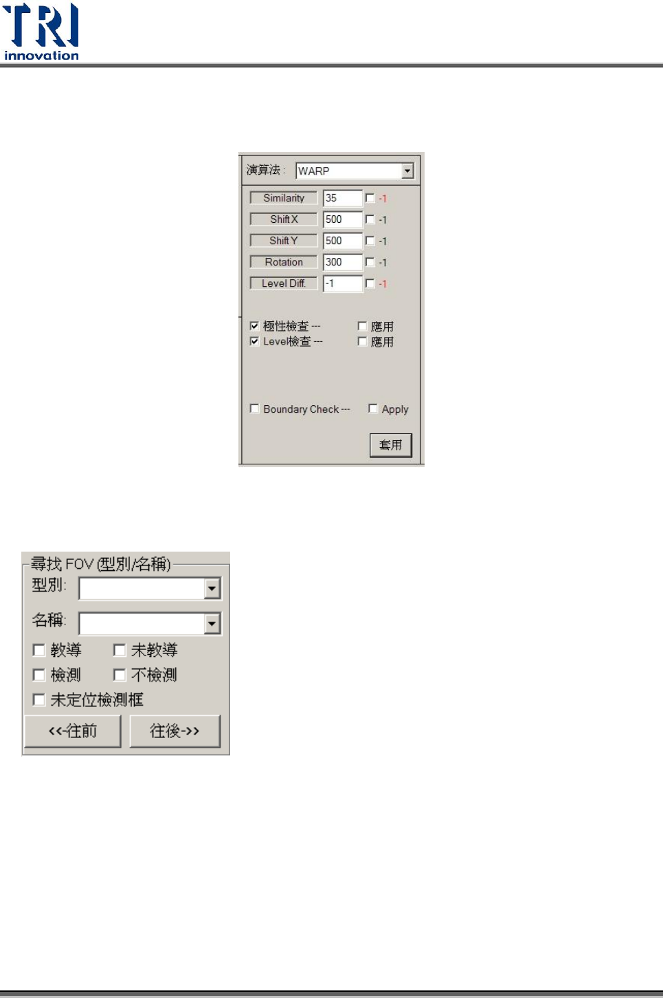 Test Resear ch Inc. TR 7500 Series User Guide – Soft ware 483 Step5. 使用者可點選後在下方設定其比對條件分數。 5.6.6 FOV 尋找區 1. 型別 輸入或以下拉式選單選擇型別作為搜尋條件。 2. 名稱 輸入或以下拉式選單選擇元件名稱作為搜尋條件。 3. 教導 勾選表示以教導過的檢測框作為搜尋條件。