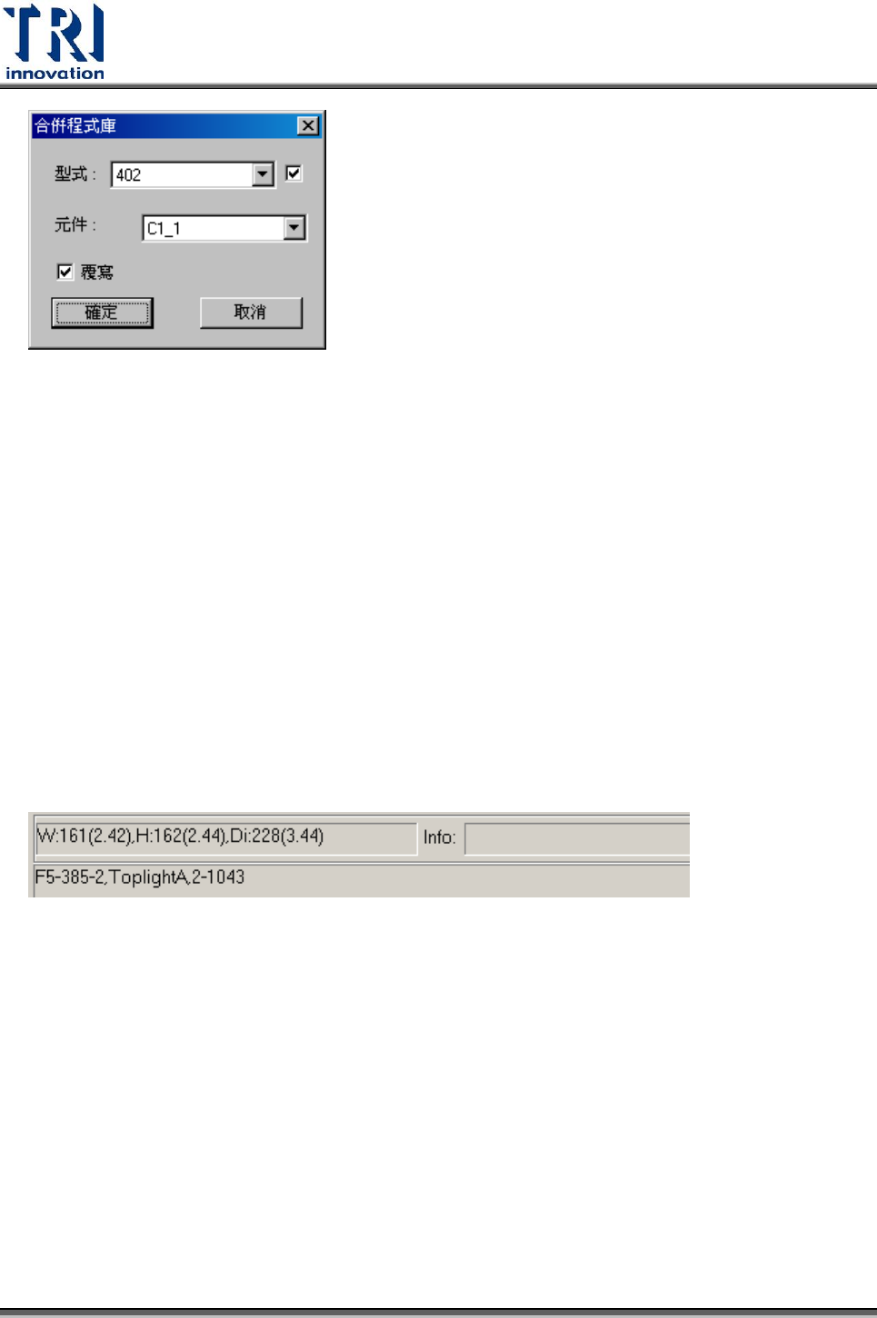 Test Resear ch Inc. TR 7500 Series User Guide – Soft ware 487 形式:選擇目標元件的形式,若在後方方塊打勾表示套用到此形式所有的元件上。 元件:若形式選項後方沒有打勾,則此欄位就要選擇一顆需要套用的元件。 覆寫:打勾表示不管原先有無檢測框一率覆寫,不打勾表示已經存在檢測框的元件 就不套用。 Step3. 重新取得 FOV 影像 6. 關閉 (Close) 將本視窗關…
