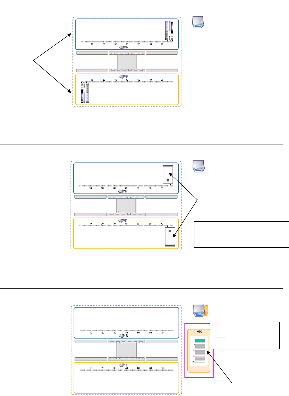分布画面上每个台架显示的缩写(F 或 LF 等)的左侧,会出现表示机械台架/电动台架的图标。