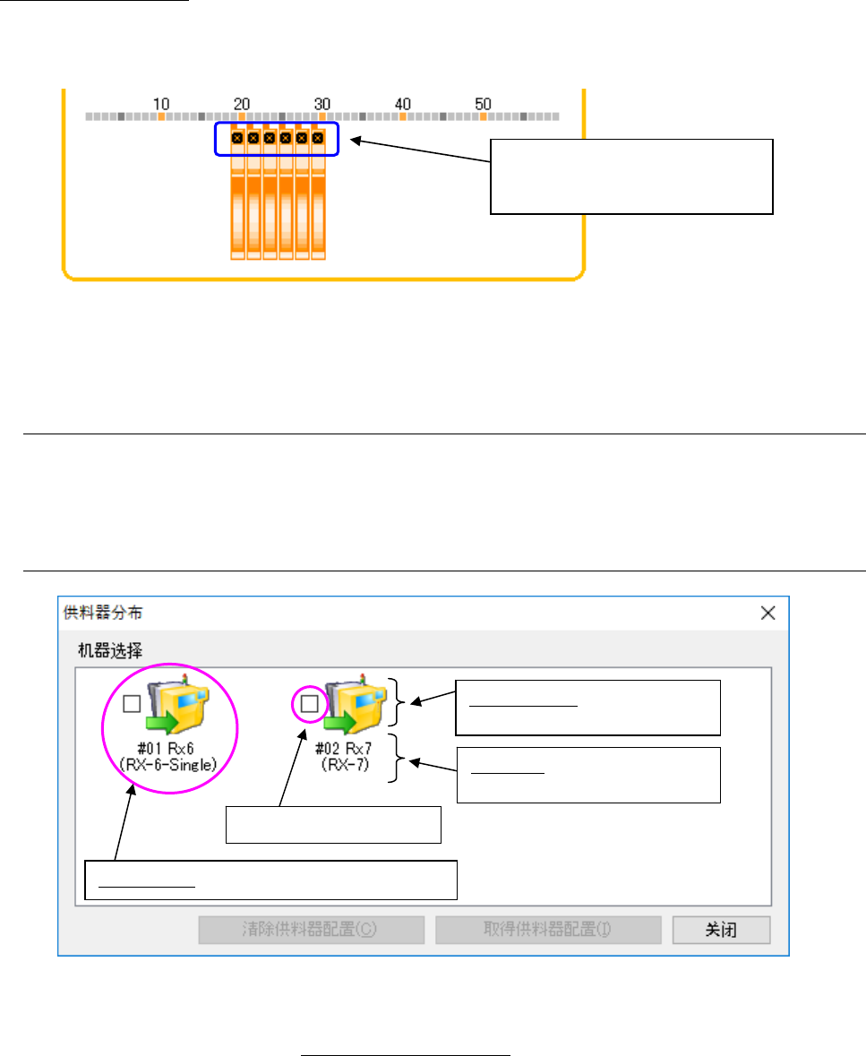 JaNets 使用说明书 5 车间作业设置 5-71 显示贴片头图像的示例 当把贴片头图像重叠在配置的送料器上时, 贴片头间隔的位置上的送料器会变为选择状态, 可以 确认送料器安装位置及贴片头的间隔。 图 5-9-5-31 显示贴片头图像模式下 的显示示例( RX-6 ) 5-9-6 机器选择对话框画面 在此画面里对机器的送料器配置进行确认、 编辑。 仅当启动机器选择对话框的应用程序为编辑程 序时,才能对送料器分布的配置进行编辑。 5-…