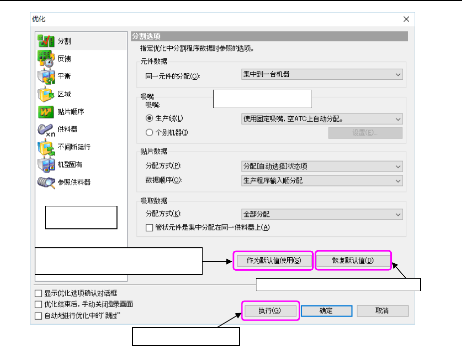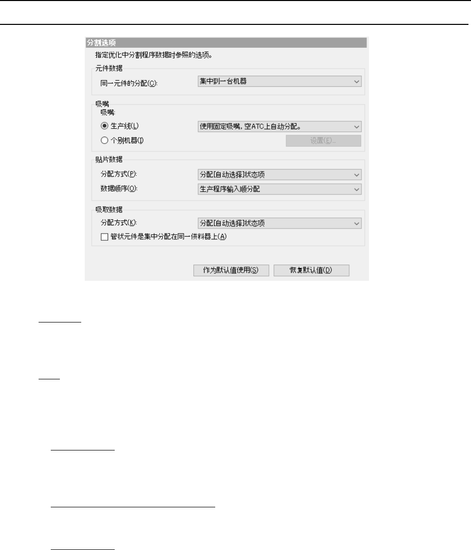 JaNets 使用说明书 7 编辑程序 7-120 7-7-4 优化选项操作方法 7-7-4-1 分割选项 图 7-7-4-1 分割选项 ( 1 ) 元件数据 同一元件具备多个供料器时,指定是仅配置到 1 台上,还是配置到多台机器上。 1 台机器时无效果选购项。 ( 2 ) 吸嘴 指定是使用「车间作业设置」中设置的吸嘴配置,还是使用优化了的吸嘴配置。但是由于 但是 RX-7 的 S16 贴片头不能作为 AT C 的吸嘴配置的制约条件进行…