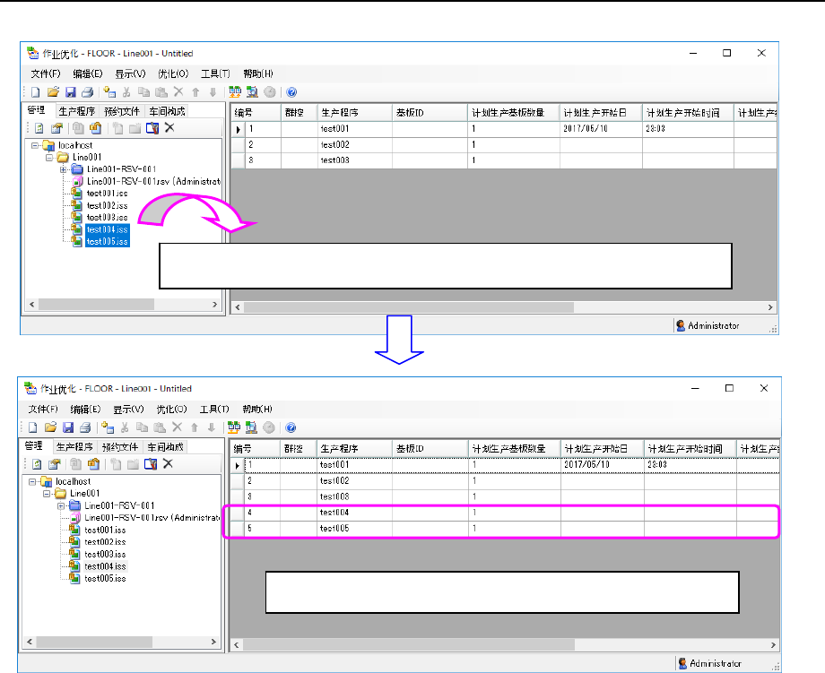 JaNets 使用说明书 8 作业优化 8-17 8-3-8-2 从数据库追加 图 8-3-8- 5 主画面(追加生产程序) 拖拉放入的生产程序追加在最后一行。 从资源管理器区域拖拉放入生产程序。