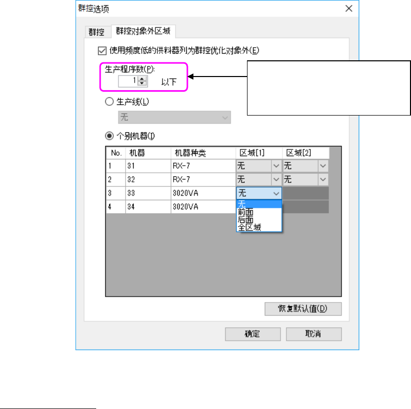 勾选「使用频率低的供料器列为群控优化对象外」时,可设置群控对象外生产程序数、及「群控对象