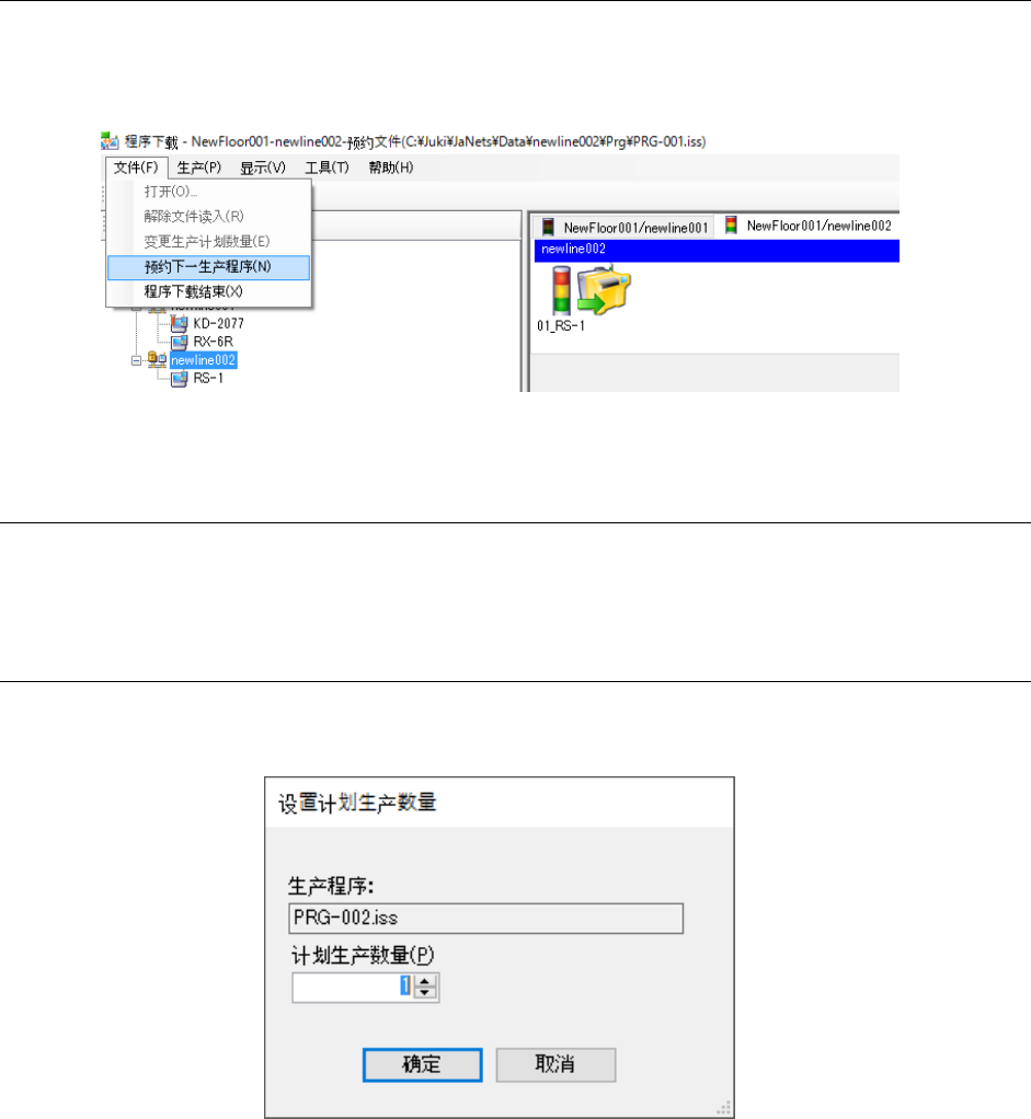 JaNets 使用说明书 13 程序下载 13-18 13-8-8-1 指定本地文件为下一生产程序 预约了后续生产程序时, 从菜单选择 「文件」 ‐ 「预约下一生产程序」 。 显示文件打开对话框, 选择 希望预约生产的程序,点击「打开」按钮。 图 13-8-8-1 预约下一生产程 序 13-8-8-2 将服务器的文件指定为下一生产程序 与「 13-8-1-2 指定服务器登录的程序时」的步骤相同, 在程序浏览器指定已优化的预约文件及生产 …