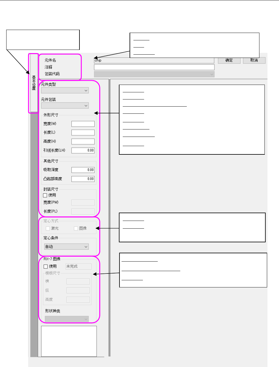 JaNets 使用说明书 1 6 程序管理器 16-9 16-3-2 基本设置画面 编辑元件基本的数据。 在元件数据库一览画面选择一个相应项目的状态下, 选择 「编辑」 ‐ 「变更」 , 或双击一览画面的网格时,会显示此画面。 图 16-3-3 基本设置画 面 点击此选项卡, 可切换画面的显示 / 隐藏。 定心方式:从“激光”及“图像”中选择。 定心条件:当上述定心为选择多项时,选择以哪个进行优先 定心。 元件名:最多可输入 60 个半…