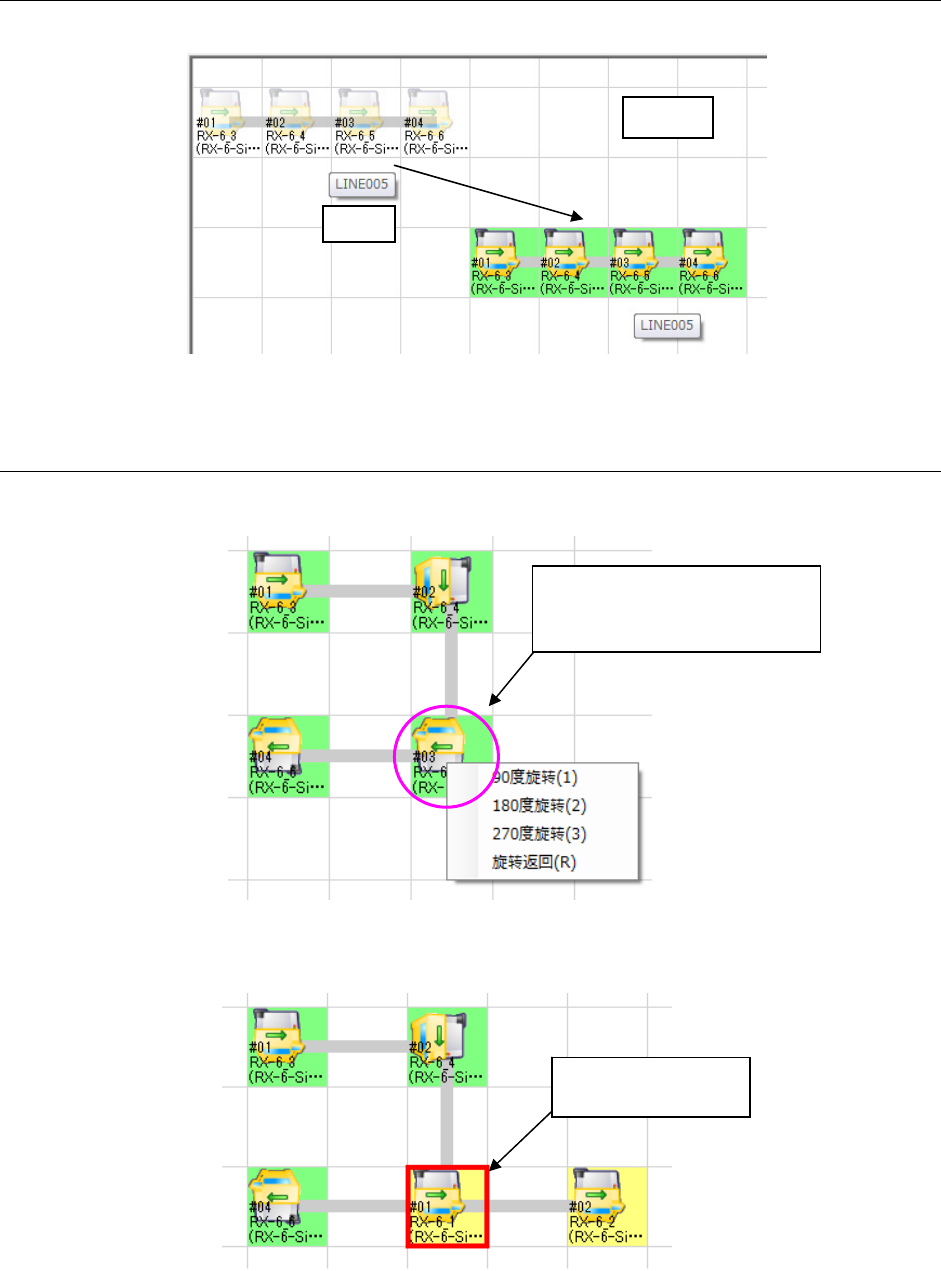 JaNets 使用说明书 5 车间作业设置 5-7 5-2-4-3 移动车间配置 图 5-2-4-6 移动生产线 5-2-4-4 调整生产线配置 图 5-2-4-7 生产线旋转 图 5-2-4-8 生产线重叠 在任意机器上点击鼠标右键 → 会在弹出菜单上显示旋转菜单。 在此选择角度。 拖放 车间图 重叠位置的机器会以 红色粗框显示。