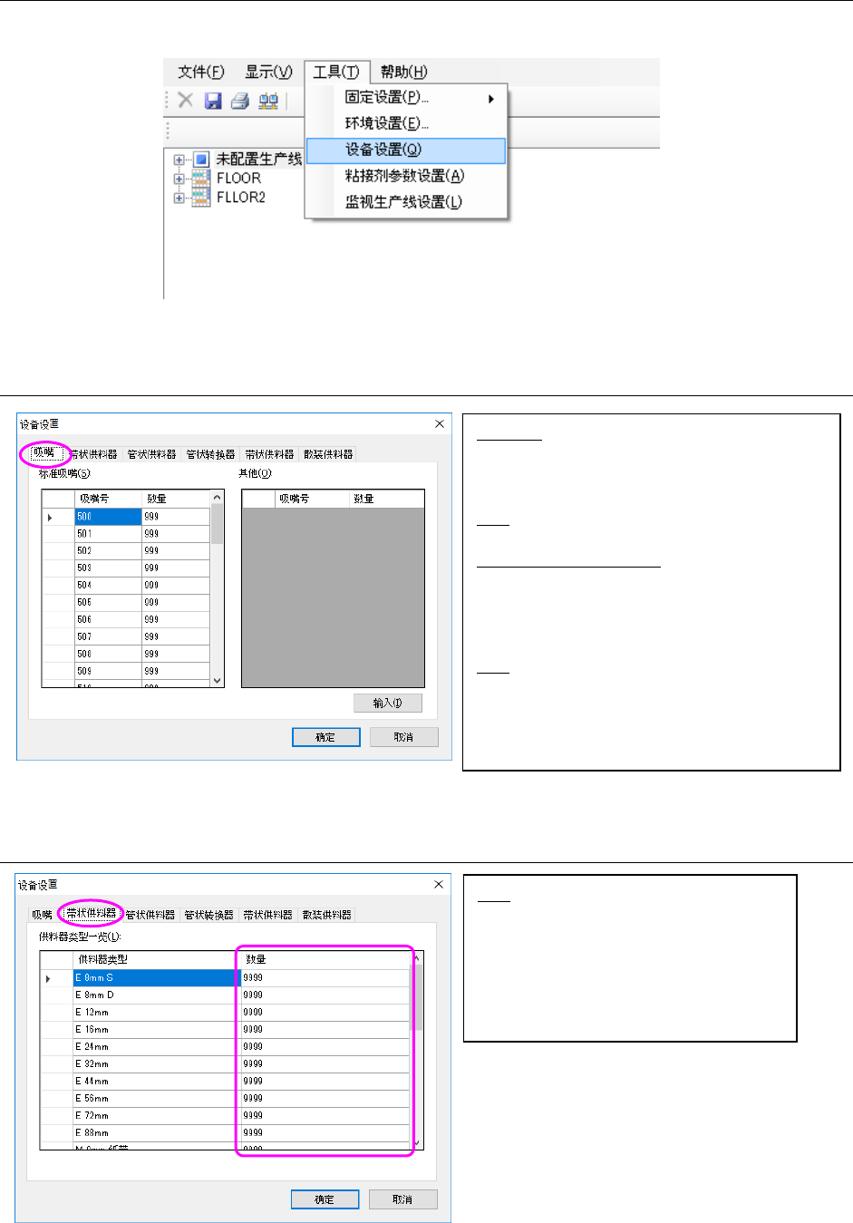 对用户所有的吸嘴及送料器的数量进行管理。点击「工具」‐「设备设置」则显示设备设置画面。