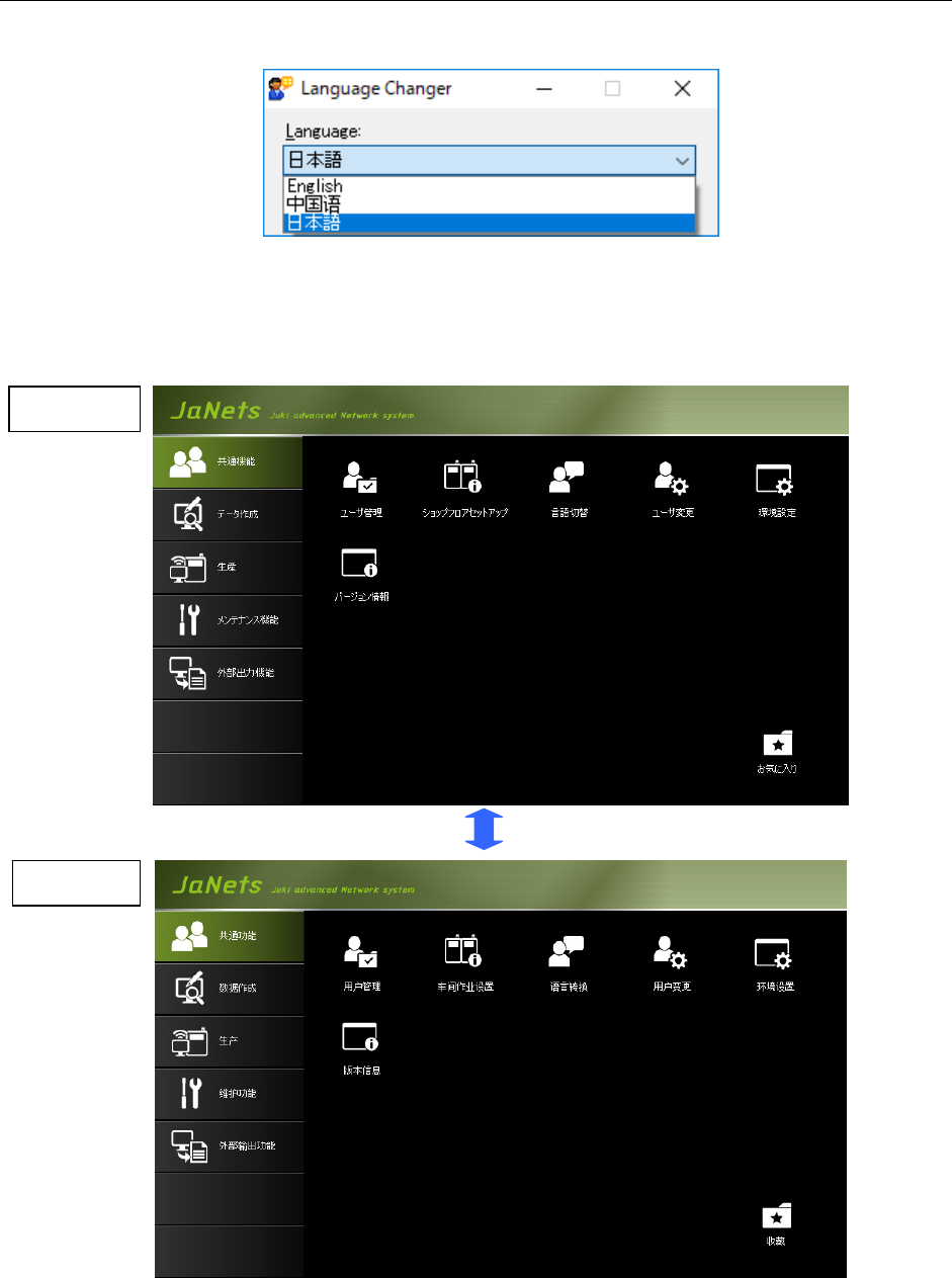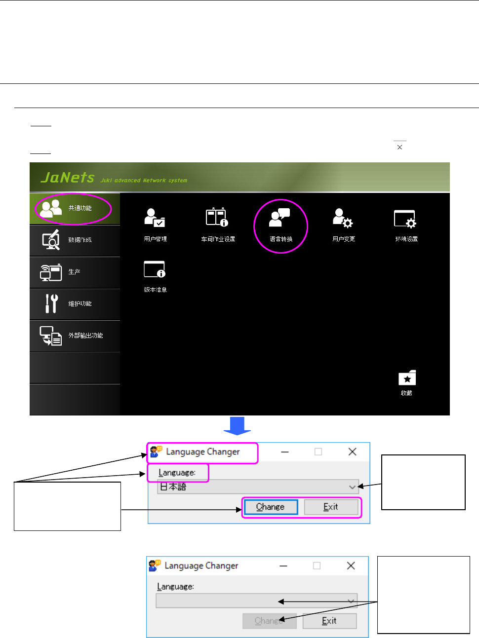 JaNets 使用说明书 6 Language Changer 6-1 第 6 章 Language Changer (语言转换工具) 什么是 Language Changer? Language Changer 是可对 JaNets 应用程序进行实时转换语言的工具。 6-1 操作步骤 6-1-1 Language Changer 的启动与退出 启动:在 JaNets 平台中双击「共通功能」 - 「语言转换」。 Language Cha…