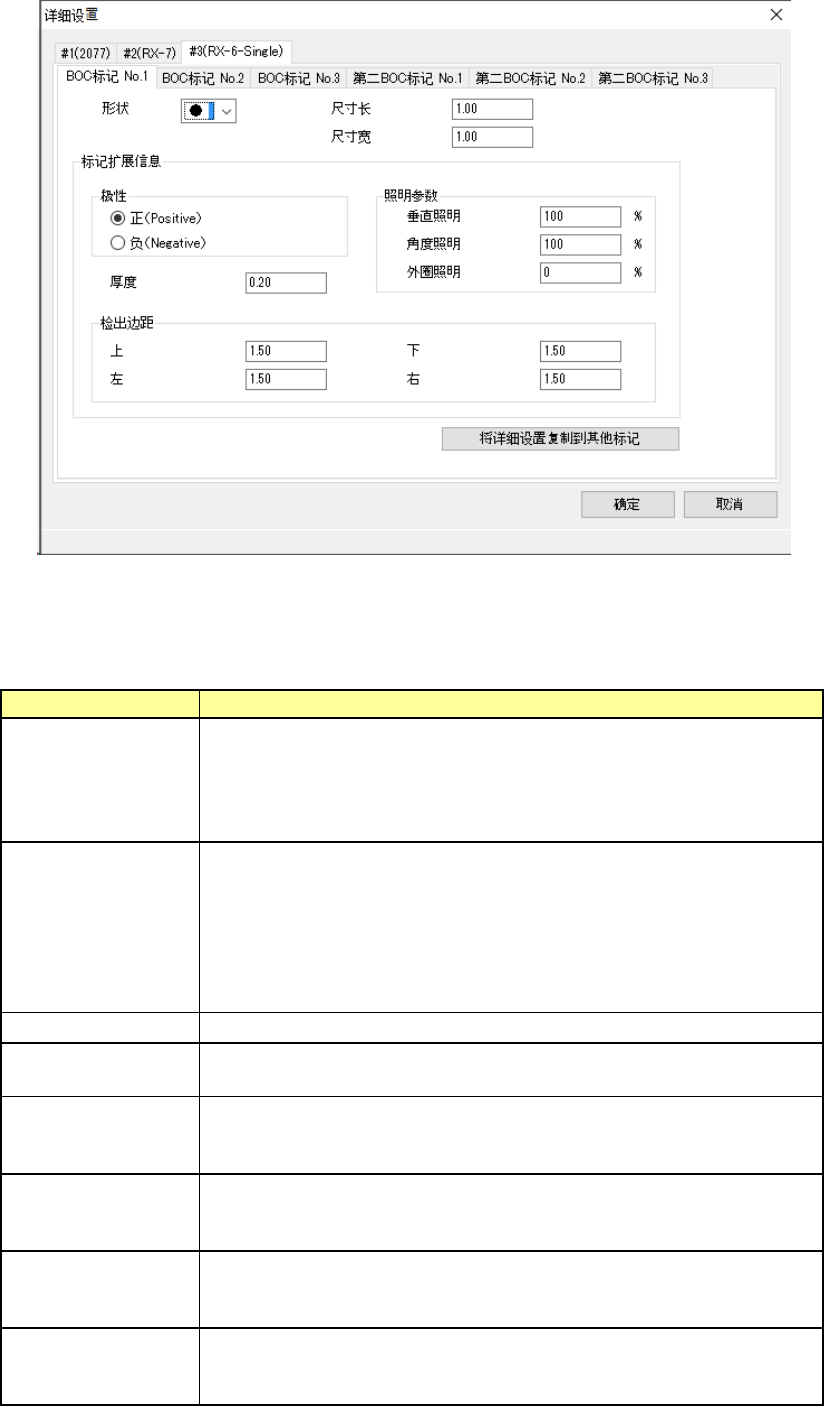 JaNets 使用说明书 7 编辑程序 7-8 项目 内容 检出边距(左) 设定检出标记的左部的宽度。 输入范围: 0.01mm ~ ( 视野-标记尺寸 )/2 默认: 1.50mm 检出边距(右) 设定检出标记的右部的宽度。 输入范围: 0.01mm ~ ( 视野-标记尺寸 )/2 默认: 1.50mm 照明参数 垂直照明 设定垂直照明。 输入范围: 0 %~ 200% 默认: 100% 照明参数 角度照明 设定角度照明。 输入范围:…