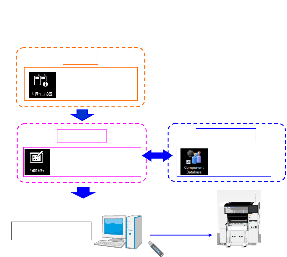 JaNets 使用说明书 1 概要 1-9 1-6-2 Line Manager 选购项 在 Basic Editor 追加 Line Manager 选购项时,在基板生产之前的流程如下所示。 与 Basic Editor 同样,可以使用 USB 闪存转移数据。 生产 : 将生产程序下载到机器里, 并在生产后进行上载 制作数据 : 将外部数据变换为 JUKI 数据 (选购项) :通过优化后的生产程序测量时 :优化供料器安排更换 :生产线…