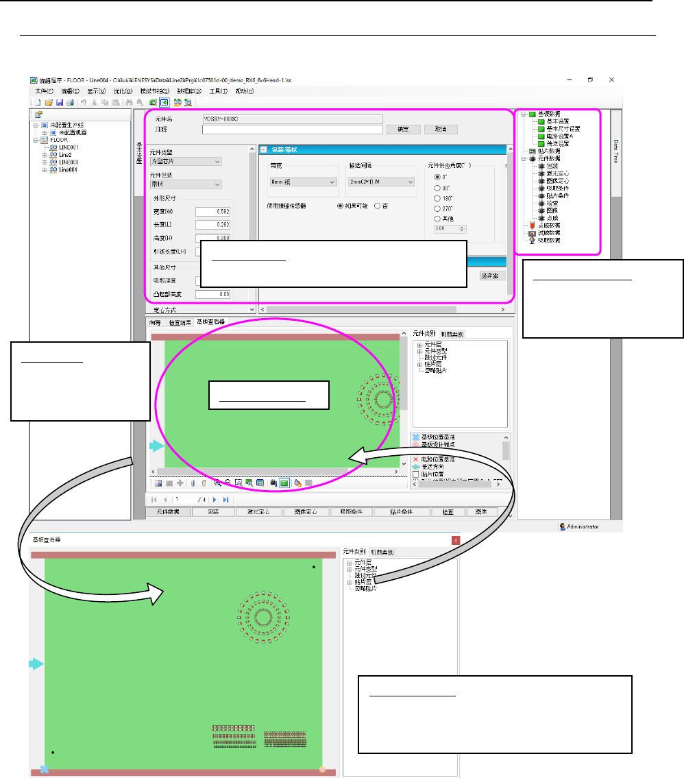 基板查看器:用图形方式确认基板传送方向、基板分布偏移量、定位孔位置、元件配置等。